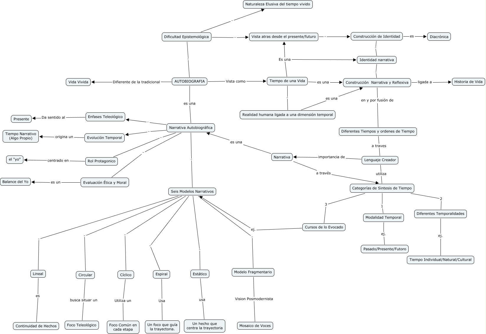 Este Cmap, tiene información relacionada con: Brockmeier, Seis Modelos Narrativos . Estático, Seis Modelos Narrativos . Lineal, Estático usa Un hecho que centra la trayectoria, Seis Modelos Narrativos . Circular, Evaluación Ética y Moral es un Balance del Yo, Rol Protagonico centrado en el "yo", Dificultad Epistemológica . Vista atras desde el presente/futuro, Tiempo de una Vida Es una Identidad narrativa, Seis Modelos Narrativos . Espiral, Dificultad Epistemológica . AUTOBIOGRAFIA, Realidad humana ligada a una dimensión temporal es una Construcción Narrativa y Reflexiva, Construcción de Identidad . Identidad narrativa, AUTOBIOGRAFIA es una Narrativa Autobiográfica, Lineal es Continuidad de Hechos, Vista atras desde el presente/futuro . Construcción de Identidad, Lenguaje Creador importancia de Narrativa, Tiempo de una Vida . Realidad humana ligada a una dimensión temporal, Seis Modelos Narrativos . Modelo Fragmentario, AUTOBIOGRAFIA Difierente de la tradicional Vida Vivida, Categorías de Sintesis de Tiempo 1 Modalidad Temporal