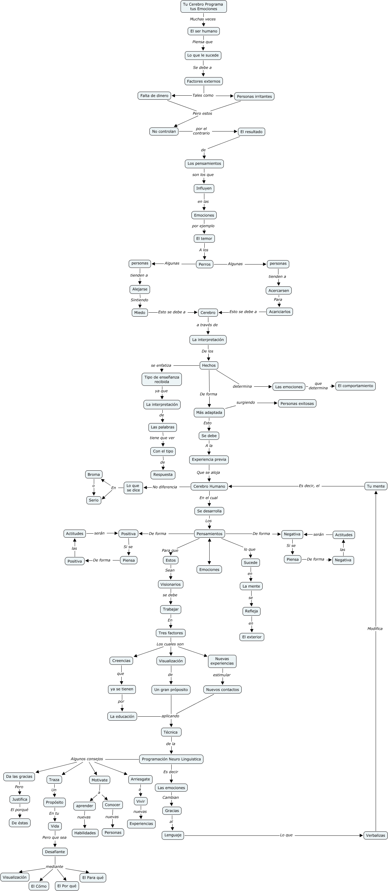 Este Cmap, tiene información relacionada con: Tu Cerebro Programa tus Emociones, Lo que se dice En Broma, El resultado de Los pensamientos, La educación aplicando Técnica, Negativa Si se Piensa, Verbalizas Modifica Tu mente, El temor A los Perros, Pensamientos Para que Estos, Broma o Serio, Programación Neuro Linguistica Algunos consejos Arriesgate, Piensa De forma Negativa, Técnica de la Programación Neuro Linguistica, Propósito En tu Vida, El ser humano Piensa que Lo que le sucede, Tres factores Los cuales son Creencias, Experiencia previa Que se aloja Cerebro Humano, Lo que le sucede Se debe a Factores externos, Desafiante mediante El Por qué, Estos Sean Visionarios, Programación Neuro Linguistica Algunos consejos Da las gracias, Gracias al Lenguaje