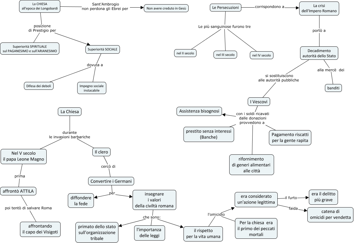 Questa Cmap, creata con IHMC CmapTools, contiene informazioni relative a: Vescovi e Monaci nell'epoca romano-barbarica, Convertire i Germani per diffondere la fede, I Vescovi con i soldi ricavati dalle donazioni provvedono a rifornimento di generi alimentari alle città, insegnare i valori della civiltà romana che sono: primato dello stato sull'organizzazione tribale, Decadimento autorità dello Stato si sostituiscono alle autorità pubbliche I Vescovi, Decadimento autorità dello Stato alla mercè dei banditi, insegnare i valori della civiltà romana che sono: il rispetto per la vita umana, era considerato un'azione legittima faida catena di omicidi per vendetta, La Chiesa durante le invasioni barbariche Nel V secolo il papa Leone Magno, il rispetto per la vita umana l'omicidio Per la chiesa era il primo dei peccati mortali, Superiorità SOCIALE dovuta a Impegno sociale instacabile, il rispetto per la vita umana l'omicidio era considerato un'azione legittima, Il clero cercò di Convertire i Germani, Le Persecuzioni Le più sanguinose furono tre nel IV secolo, La CHIESA all'epoca dei Longobardi posizione di Prestigio per Superiorità SPIRITUALE sul PAGANESIMO e sull'ARIANESIMO, Le Persecuzioni Le più sanguinose furono tre nel III secolo, insegnare i valori della civiltà romana che sono: l'importanza delle leggi, Le Persecuzioni Le più sanguinose furono tre nel II secolo, Nel V secolo il papa Leone Magno prima affrontò ATTILA, La crisi dell'Impero Romano portò a Decadimento autorità dello Stato, Superiorità SOCIALE dovuta a Difesa dei deboli