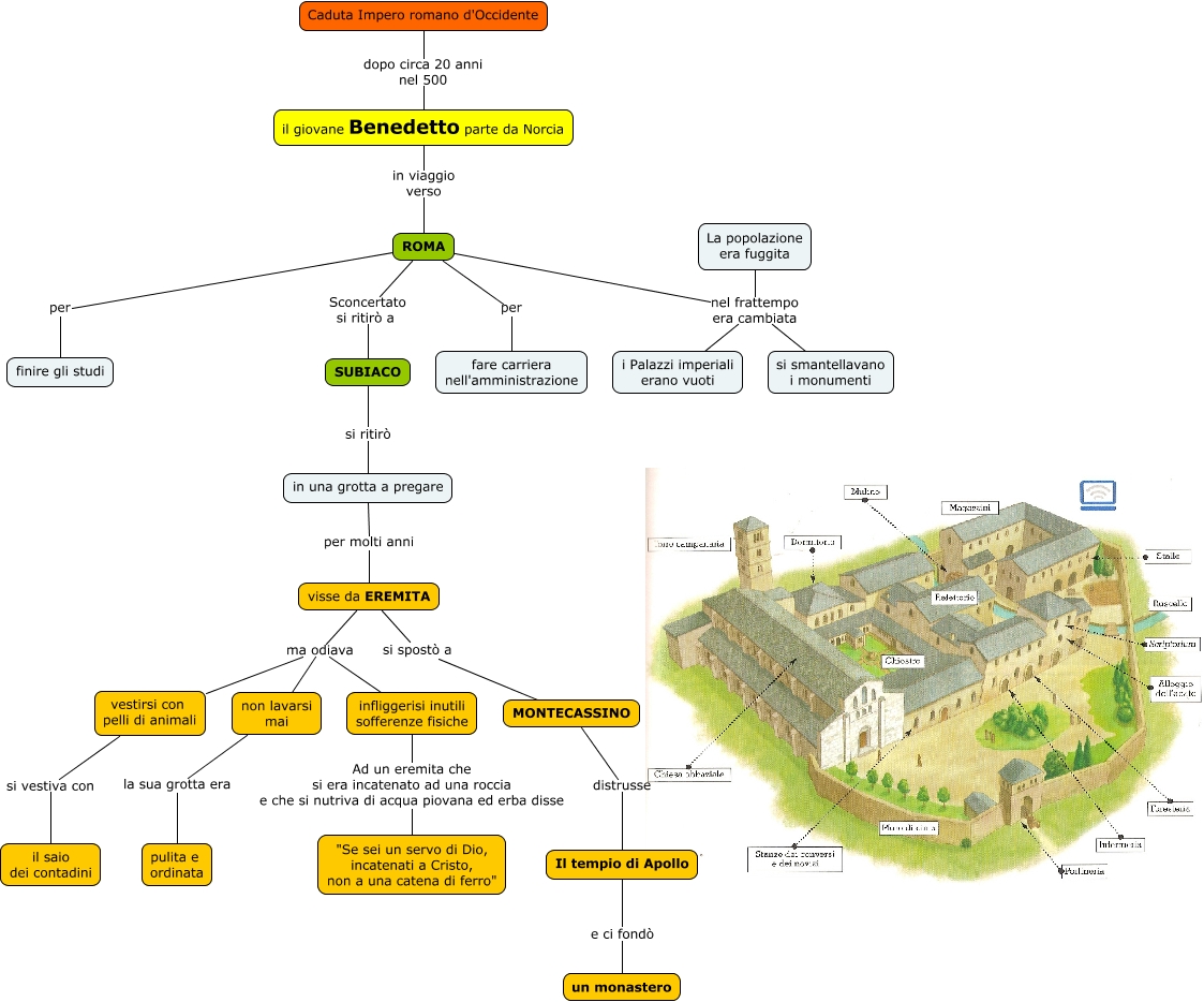 Questa Cmap, creata con IHMC CmapTools, contiene informazioni relative a: San Benedetto da Norcia, vestirsi con pelli di animali si vestiva con il saio dei contadini, visse da EREMITA si spostò a MONTECASSINO, ROMA per fare carriera nell'amministrazione, visse da EREMITA ma odiava infliggerisi inutili sofferenze fisiche, ROMA nel frattempo era cambiata i Palazzi imperiali erano vuoti, MONTECASSINO distrusse Il tempio di Apollo, infliggerisi inutili sofferenze fisiche Ad un eremita che si era incatenato ad una roccia e che si nutriva di acqua piovana ed erba disse "Se sei un servo di Dio, incatenati a Cristo, non a una catena di ferro", La popolazione era fuggita nel frattempo era cambiata si smantellavano i monumenti, Il tempio di Apollo e ci fondò un monastero, ROMA per finire gli studi, Caduta Impero romano d'Occidente dopo circa 20 anni nel 500 il giovane Benedetto parte da Norcia, visse da EREMITA ma odiava non lavarsi mai, SUBIACO si ritirò in una grotta a pregare, ROMA nel frattempo era cambiata si smantellavano i monumenti, il giovane Benedetto parte da Norcia in viaggio verso ROMA, visse da EREMITA ma odiava vestirsi con pelli di animali, La popolazione era fuggita nel frattempo era cambiata i Palazzi imperiali erano vuoti, in una grotta a pregare per molti anni visse da EREMITA, non lavarsi mai la sua grotta era pulita e ordinata, ROMA Sconcertato si ritirò a SUBIACO
