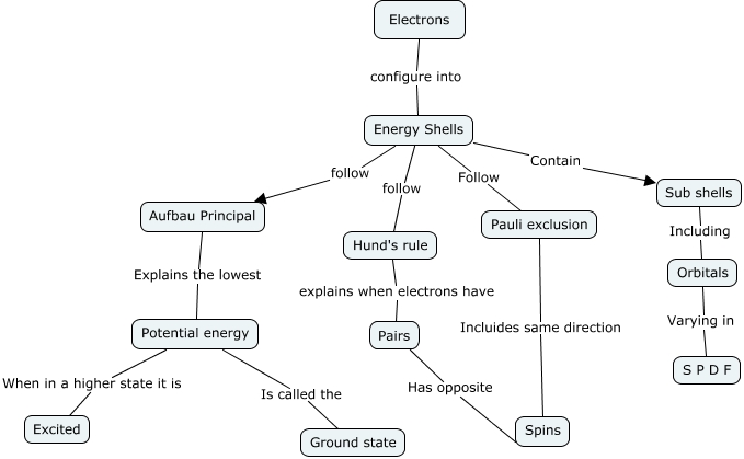 This Concept Map, created with IHMC CmapTools, has information related to: Elctron Configuration, Pauli exclusion Incluides same direction Spins, Pairs Has opposite Spins, Energy Shells follow Hund's rule, Hund's rule explains when electrons have Pairs, Aufbau Principal Explains the lowest Potential energy, Energy Shells Contain Sub shells, Orbitals Varying in S P D F, Electrons configure into Energy Shells, Energy Shells follow Aufbau Principal, Sub shells Including Orbitals, Energy Shells Follow Pauli exclusion, Potential energy When in a higher state it is Excited, Potential energy Is called the Ground state