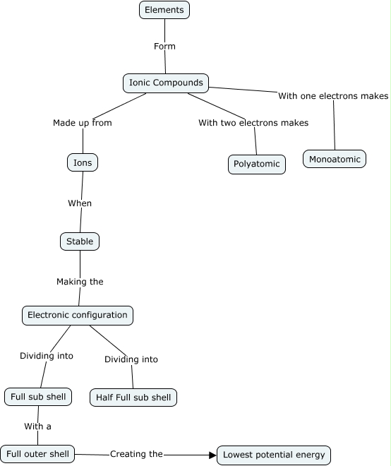 This Concept Map, created with IHMC CmapTools, has information related to: Ionic Compounds, Ions When Stable, Electronic configuration Dividing into Full sub shell, Ionic Compounds With one electrons makes Monoatomic, Ionic Compounds With two electrons makes Polyatomic, Elements Form Ionic Compounds, Ionic Compounds Made up from Ions, Full sub shell With a Full outer shell, Full outer shell Creating the Lowest potential energy, Electronic configuration Dividing into Half Full sub shell, Stable Making the Electronic configuration