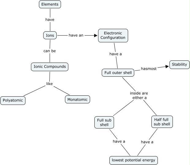 This Concept Map, created with IHMC CmapTools, has information related to: Forming Ionic Compounds, Half full sub shell have a lowest potential energy, Ionic Compounds like Monatomic, Ions can be Ionic Compounds, Electronic Configuration have a Full outer shell, Ions have an Electronic Configuration, Full sub shell have a lowest potential energy, Full outer shell hasmost Stability, Full outer shell inside are either a Half full sub shell, Elements have Ions, Ionic Compounds like Polyatomic, Full outer shell inside are either a Full sub shell