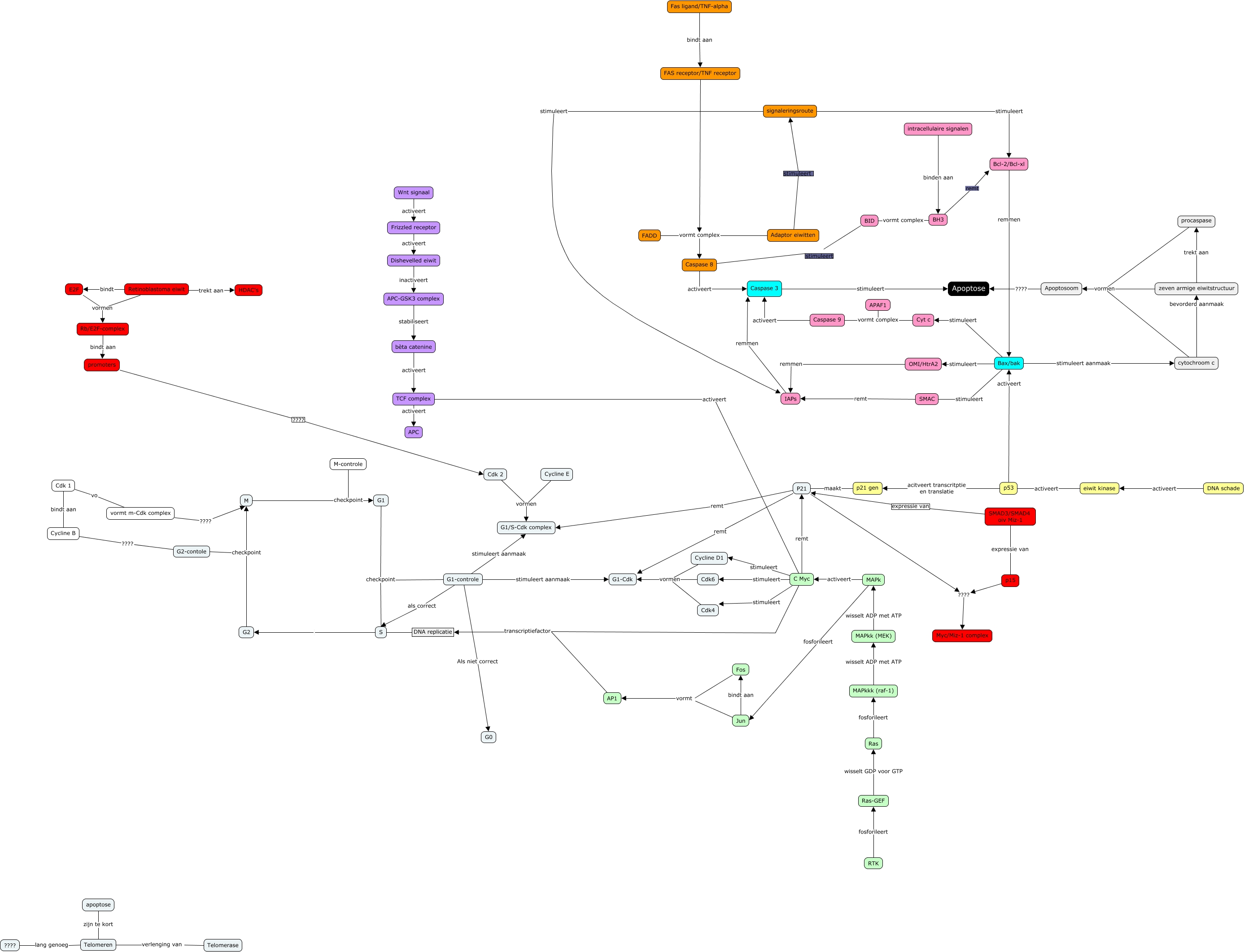 Deze Concept Map heeft informatie gerelateerd aan: cmap 1.6.cmap, Cycline D1 vormen G1-Cdk, FAS receptor/TNF receptor vormt complex Adaptor eiwitten, Retinoblastoma eiwit bindt E2F, zeven armige eiwitstructuur vormen Apoptosoom, BH3 vormt complex BID, Rb/E2F-complex bindt aan promoters, Adaptor eiwitten stimuleert signaleringsroute, G1-controle als correct S, Cdk 1 vo vormt m-Cdk complex, Caspase 3 stimuleert Apoptose, MAPk activeert C Myc, C Myc stimuleert Cdk4, APAF1 vormt complex Cyt c, Ras-GEF wisselt GDP voor GTP Ras, M-controle checkpoint G1, BH3 remt Bcl-2/Bcl-xl, Telomeren zijn te kort apoptose, Caspase 8 activeert Caspase 3, Caspase 8 stimuleert BID, Retinoblastoma eiwit vormen Rb/E2F-complex