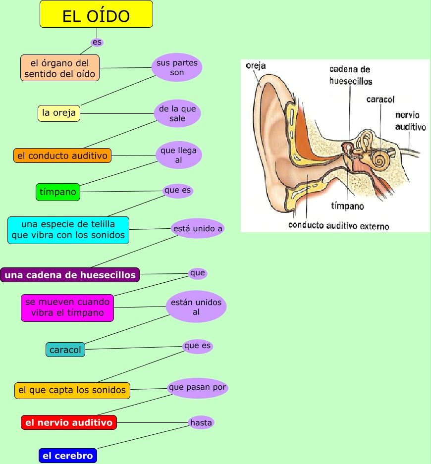 Este Cmap, tiene información relacionada con: El oído, tímpano que es una especie de telilla que vibra con los sonidos, se mueven cuando vibra el tímpano están unidos al caracol, el conducto auditivo que llega al tímpano, el que capta los sonidos que pasan por el nervio auditivo, una cadena de huesecillos que se mueven cuando vibra el tímpano, EL OÍDO es el órgano del sentido del oído, caracol que es el que capta los sonidos, el órgano del sentido del oído sus partes son la oreja, el nervio auditivo hasta el cerebro, una especie de telilla que vibra con los sonidos está unido a una cadena de huesecillos, la oreja de la que sale el conducto auditivo