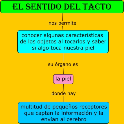 Este Cmap, tiene información relacionada con: El sentido del tacto, conocer algunas características de los objetos al tocarlos y saber si algo toca nuestra piel su órgano es la piel, EL SENTIDO DEL TACTO nos permite conocer algunas características de los objetos al tocarlos y saber si algo toca nuestra piel, la piel donde hay multitud de pequeños receptores que captan la información y la envían al cerebro