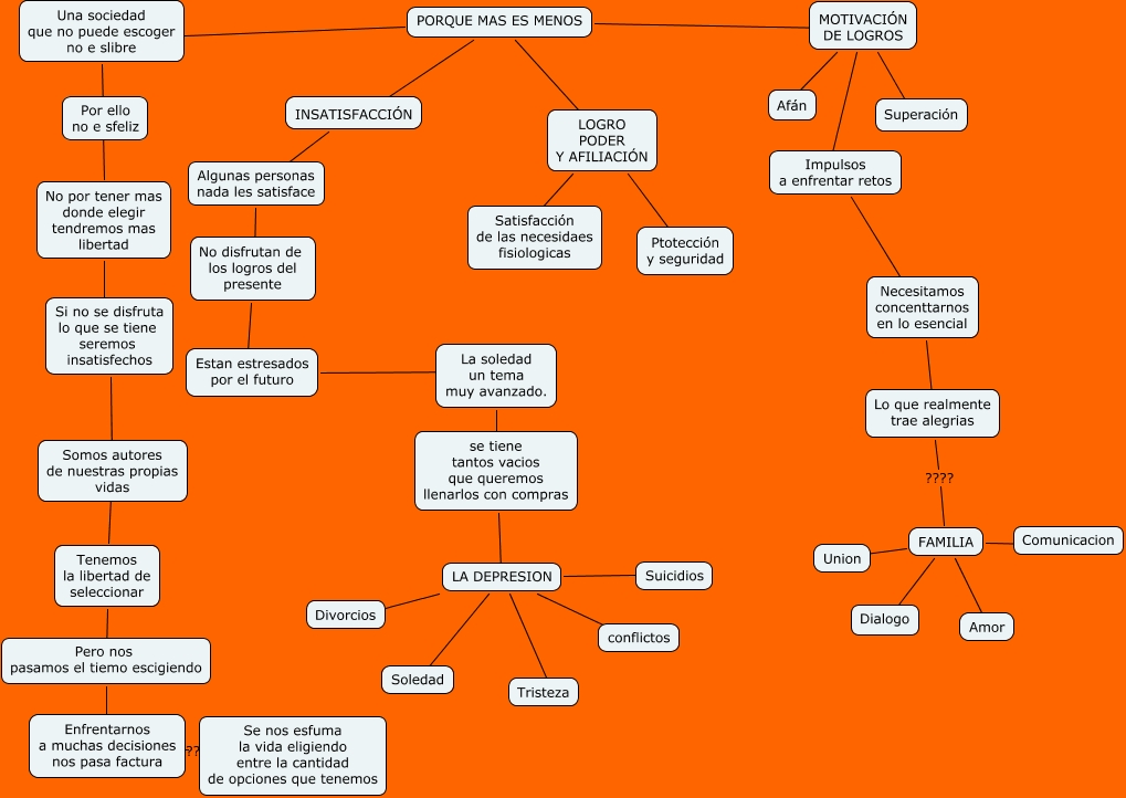 Este Cmap, tiene información relacionada con: PORQUE MAS E SMENOS, Si no se disfruta lo que se tiene seremos insatisfechos ???? Tenemos la libertad de seleccionar, Lo que realmente trae alegrias ???? FAMILIA, MOTIVACIÓN DE LOGROS ???? Afán, Enfrentarnos a muchas decisiones nos pasa factura ???? Se nos esfuma la vida eligiendo entre la cantidad de opciones que tenemos, se tiene tantos vacios que queremos llenarlos con compras ???? LA DEPRESION, PORQUE MAS ES MENOS ???? MOTIVACIÓN DE LOGROS, Estan estresados por el futuro ???? La soledad un tema muy avanzado., LA DEPRESION ???? Divorcios, FAMILIA ???? Amor, LA DEPRESION ???? Tristeza, Tenemos la libertad de seleccionar ???? Pero nos pasamos el tiemo escigiendo, Una sociedad que no puede escoger no e slibre ???? Por ello no e sfeliz, INSATISFACCIÓN ???? Algunas personas nada les satisface, No por tener mas donde elegir tendremos mas libertad ???? Si no se disfruta lo que se tiene seremos insatisfechos, Necesitamos concenttarnos en lo esencial ???? Lo que realmente trae alegrias, Algunas personas nada les satisface ???? No disfrutan de los logros del presente, LA DEPRESION ???? conflictos, LA DEPRESION ???? Soledad, La soledad un tema muy avanzado. ???? se tiene tantos vacios que queremos llenarlos con compras, Si no se disfruta lo que se tiene seremos insatisfechos ???? Somos autores de nuestras propias vidas