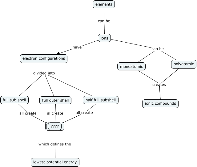 This Concept Map, created with IHMC CmapTools, has information related to: ionic compounds, elements can be ions, ions can be monoatomic, electron configurations divided into full sub shell, full sub shell all create ????, ions have electron configurations, stabiity which defines the lowest potential energy, electron configurations divided into full outer shell, full outer shell al create stabiity, half full subshell all create ????, monoatomic ionic compounds, electron configurations divided into half full subshell, ions can be polyatomic, polyatomic creates ????