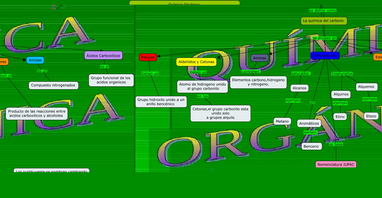 Este Cmap, tiene información relacionada con: Quimica organica.cmap suge.cmap, La quimica del carbono se dividen en Aldehídos y Cetonas, hidrocarburos Insaturados Alquinos, hidrocarburos saturados Alcanos, La quimica del carbono se dividen en Aminas, Aromáticos ejemplo Benceno, hidrocarburos en Aromáticos, Aldehídos y Cetonas tienen un Atomo de hidrogeno unido al grupo carbonilo, Ácidos Carboxilicos es el Grupo funcional de los acidos organicos, Alquinos ejemplo Etino, Nomenclatura IUPAC sus reglas determinar el numero de carbonos de la cadena mas larga, llamada cadena principal alcano., Alcanos ejemplo Metano, Atomo de hidrogeno unido al grupo carbonilo en las Cetonas,el grupo carbonilo esta unido solo a grupos alquilo, Fenoles tienen un Grupo hidroxilo unido a un anillo bencénico, La quimica del carbono se dividen en Ácidos Carboxilicos, La quimica del carbono se dividen en Esteres, Amidas es un Compuesto nitrogenados, La quimica del carbono se dividen en hidrocarburos, Química Orgánica se basa Nomenclatura IUPAC, La quimica del carbono se dividen en Amidas, Aminas contienen Elementos carbono,hidrogeno y nitrogeno.