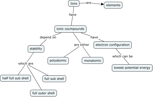 This Concept Map, created with IHMC CmapTools, has information related to: ionic compounds, Ions are elements, stability which are full sub shell, stability which are half full sub shell, stability which are full outer shell, ionic cocmpounds are either monatomic, ionic cocmpounds have electron configuration, ionic cocmpounds depend on stability, electron configuration which can be lowest potential energy, Ions have ionic cocmpounds, ionic cocmpounds are either polyatomic
