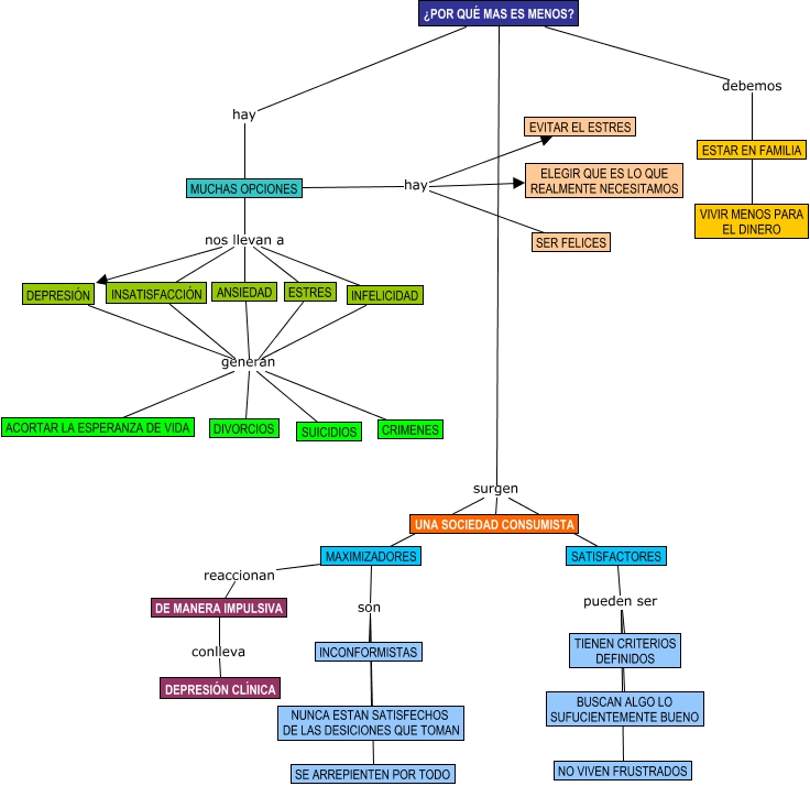 Este Cmap, tiene información relacionada con: Por que mas es menos, ¿POR QUÉ MAS ES MENOS? debemos VIVIR MENOS PARA EL DINERO, ANSIEDAD generan CRIMENES, INSATISFACCIÓN generan ACORTAR LA ESPERANZA DE VIDA, ¿POR QUÉ MAS ES MENOS? surgen UNA SOCIEDAD CONSUMISTA, MAXIMIZADORES son SE ARREPIENTEN POR TODO, ANSIEDAD generan ACORTAR LA ESPERANZA DE VIDA, MUCHAS OPCIONES nos llevan a INFELICIDAD, MUCHAS OPCIONES hay EVITAR EL ESTRES, INFELICIDAD generan ACORTAR LA ESPERANZA DE VIDA, MAXIMIZADORES son NUNCA ESTAN SATISFECHOS DE LAS DESICIONES QUE TOMAN, DEPRESIÓN generan DIVORCIOS, DEPRESIÓN generan CRIMENES, MAXIMIZADORES reaccionan DE MANERA IMPULSIVA, DEPRESIÓN generan ACORTAR LA ESPERANZA DE VIDA, ESTRES generan ACORTAR LA ESPERANZA DE VIDA, ¿POR QUÉ MAS ES MENOS? surgen SATISFACTORES, INFELICIDAD generan CRIMENES, SATISFACTORES pueden ser TIENEN CRITERIOS DEFINIDOS, MUCHAS OPCIONES nos llevan a DEPRESIÓN, SATISFACTORES pueden ser BUSCAN ALGO LO SUFUCIENTEMENTE BUENO