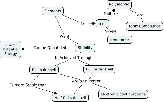 This Concept Map, created with IHMC CmapTools, has information related to: Untitled 1, Full outer shell Are all different Electronic configurations, Half full sub shell Are all different Electronic configurations, Ions Multiple Polyatomic, Ions Single Monatomic, Polyatomic Are Ionic Compounds, Elements Are Ions, Stability Can be Quantified Lowest Potential Energy, Stability Is Achieved Through Full outer shell, Stability Is Achieved Through Full sub shell, Elements Want Stability, Full sub shell Is more Stable than Half full sub shell, Full sub shell Are all different Electronic configurations
