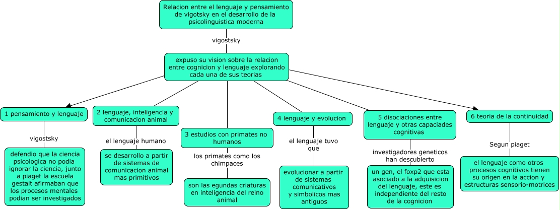 Este Cmap, tiene información relacionada con: relacion entre lenguaje y pensamiento, Relacion entre el lenguaje y pensamiento de vigotsky en el desarrollo de la psicolinguistica moderna vigostsky expuso su vision sobre la relacion entre cognicion y lenguaje explorando cada una de sus teorias, 6 teoria de la continuidad Segun piaget el lenguaje como otros procesos cognitivos tienen su origen en la accion y estructuras sensorio-motrices, expuso su vision sobre la relacion entre cognicion y lenguaje explorando cada una de sus teorias ???? 6 teoria de la continuidad, expuso su vision sobre la relacion entre cognicion y lenguaje explorando cada una de sus teorias ???? 1 pensamiento y lenguaje, expuso su vision sobre la relacion entre cognicion y lenguaje explorando cada una de sus teorias ???? 5 disociaciones entre lenguaje y otras capaciades cognitivas, 5 disociaciones entre lenguaje y otras capaciades cognitivas investigadores geneticos han descubierto un gen, el foxp2 que esta asociado a la adquisicion del lenguaje, este es independiente del resto de la cognicion, expuso su vision sobre la relacion entre cognicion y lenguaje explorando cada una de sus teorias ???? 2 lenguaje, inteligencia y comunicacion animal, expuso su vision sobre la relacion entre cognicion y lenguaje explorando cada una de sus teorias ???? 4 lenguaje y evolucion, 2 lenguaje, inteligencia y comunicacion animal el lenguaje humano se desarrollo a partir de sistemas de comunicacion animal mas primitivos, 1 pensamiento y lenguaje vigostsky defendio que la ciencia psicologica no podia ignorar la ciencia, junto a piaget la escuela gestalt afirmaban que los procesos mentales podian ser investigados, expuso su vision sobre la relacion entre cognicion y lenguaje explorando cada una de sus teorias ???? 3 estudios con primates no humanos, 3 estudios con primates no humanos los primates como los chimpaces son las egundas criaturas en inteligencia del reino animal, 4 lenguaje y evolucion el lenguaje tuvo que evolucionar a partir de sistemas comunicativos y simbolicos mas antiguos
