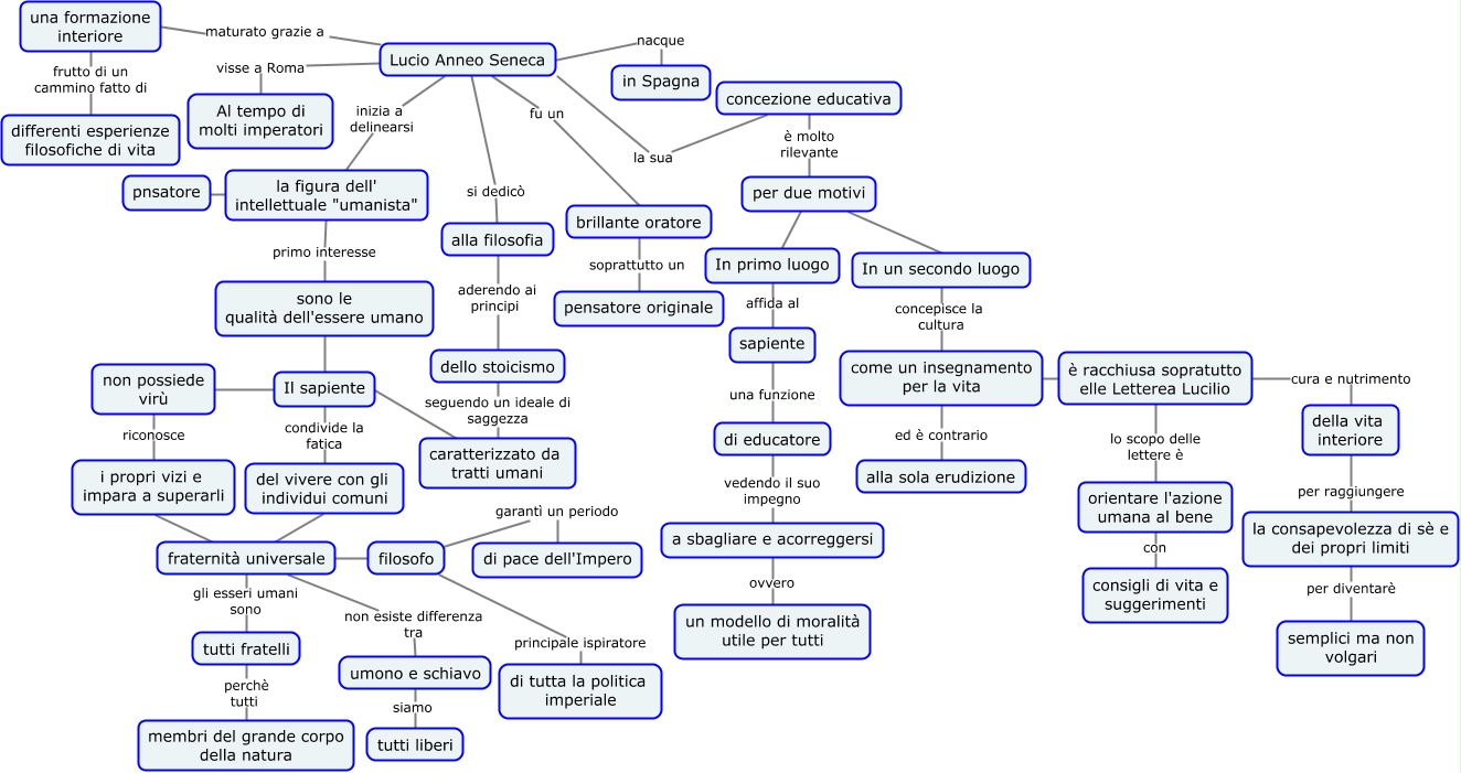 Questa Cmap, creata con IHMC CmapTools, contiene informazioni relative a: Seneca completo, Lucio Anneo Seneca maturato grazie a una formazione interiore, Lucio Anneo Seneca si dedicò alla filosofia, In un secondo luogo concepisce la cultura come un insegnamento per la vita, dello stoicismo seguendo un ideale di saggezza caratterizzato da tratti umani, Il sapiente non possiede virù, Il sapiente sono le qualità dell'essere umano, a sbagliare e acorreggersi ovvero un modello di moralità utile per tutti, sapiente una funzione di educatore, per due motivi In primo luogo, per due motivi In un secondo luogo, Il sapiente caratterizzato da tratti umani, la figura dell' intellettuale "umanista" pnsatore, Lucio Anneo Seneca nacque in Spagna, fraternità universale gli esseri umani sono tutti fratelli, In primo luogo affida al sapiente, una formazione interiore frutto di un cammino fatto di differenti esperienze filosofiche di vita, la figura dell' intellettuale "umanista" primo interesse sono le qualità dell'essere umano, Lucio Anneo Seneca inizia a delinearsi la figura dell' intellettuale "umanista", filosofo garantì un periodo di pace dell'Impero, Lucio Anneo Seneca fu un brillante oratore