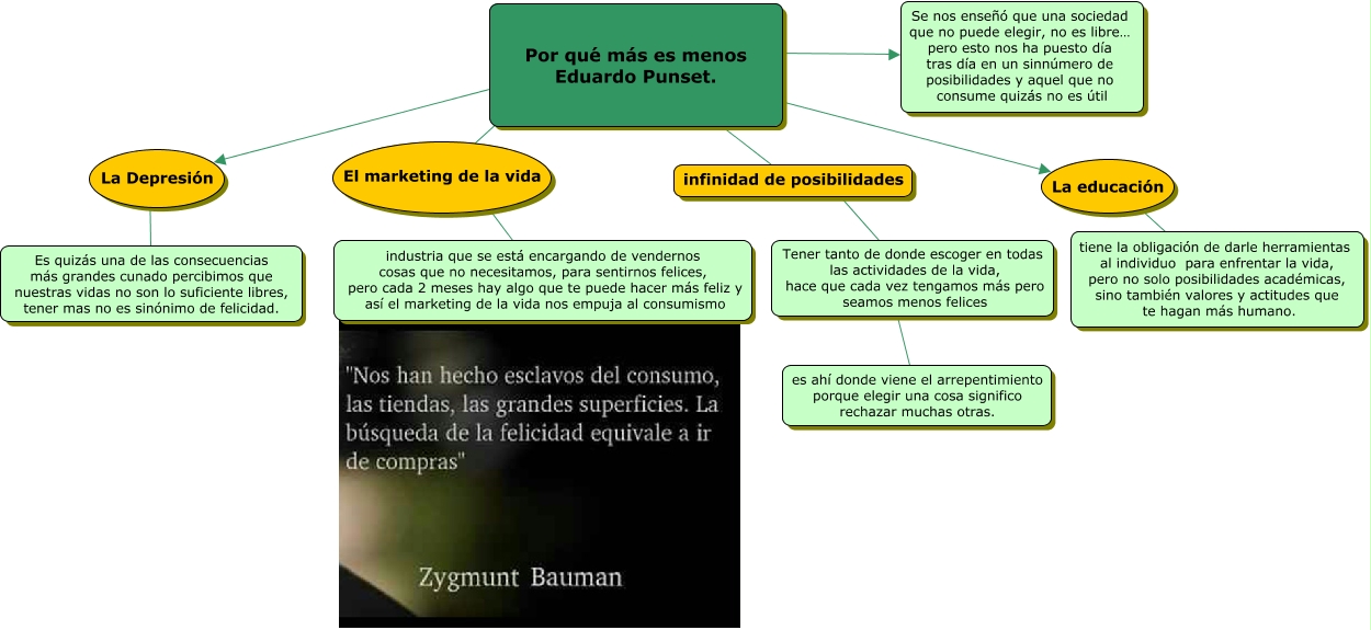 Este Cmap, tiene información relacionada con: porque mas es menos, Por qué más es menos Eduardo Punset. ???? El marketing de la vida, Por qué más es menos Eduardo Punset. ???? infinidad de posibilidades, Por qué más es menos Eduardo Punset. ???? La educación, Por qué más es menos Eduardo Punset. ???? Se nos enseñó que una sociedad que no puede elegir, no es libre… pero esto nos ha puesto día tras día en un sinnúmero de posibilidades y aquel que no consume quizás no es útil, infinidad de posibilidades ???? Tener tanto de donde escoger en todas las actividades de la vida, hace que cada vez tengamos más pero seamos menos felices, Por qué más es menos Eduardo Punset. ???? La Depresión, La Depresión ???? Es quizás una de las consecuencias más grandes cunado percibimos que nuestras vidas no son lo suficiente libres, tener mas no es sinónimo de felicidad., El marketing de la vida ???? industria que se está encargando de vendernos cosas que no necesitamos, para sentirnos felices, pero cada 2 meses hay algo que te puede hacer más feliz y así el marketing de la vida nos empuja al consumismo, Tener tanto de donde escoger en todas las actividades de la vida, hace que cada vez tengamos más pero seamos menos felices ???? es ahí donde viene el arrepentimiento porque elegir una cosa significo rechazar muchas otras., La educación ???? tiene la obligación de darle herramientas al individuo para enfrentar la vida, pero no solo posibilidades académicas, sino también valores y actitudes que te hagan más humano.