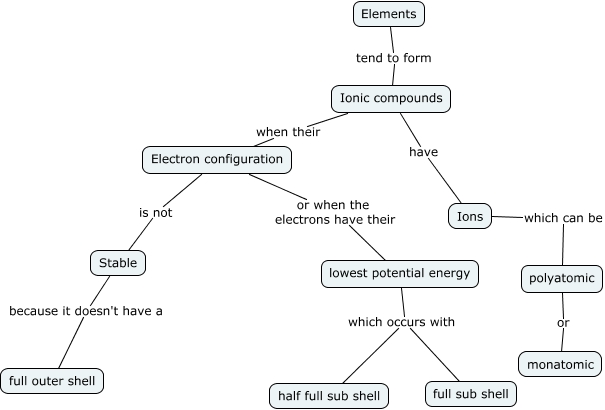 This Concept Map, created with IHMC CmapTools, has information related to: Ionic Compounds, polyatomic or monatomic, Ionic compounds have Ions, lowest potential energy which occurs with half full sub shell, lowest potential energy which occurs with full sub shell, Ionic compounds when their Electron configuration, Electron configuration or when the electrons have their lowest potential energy, Stable because it doesn't have a full outer shell, Ions which can be polyatomic, Electron configuration is not Stable, Elements tend to form Ionic compounds