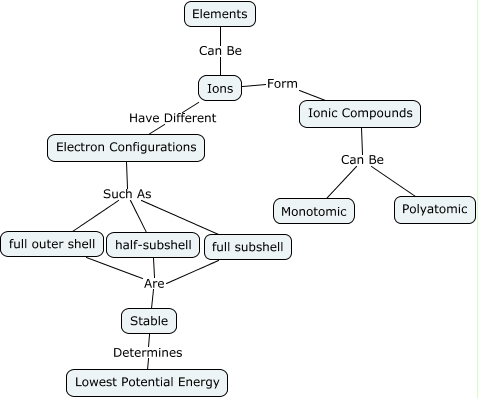 This Concept Map, created with IHMC CmapTools, has information related to: Ionic Compounds, Electron Configurations Such As full subshell, Ionic Compounds Can Be Polyatomic, Stable Determines Lowest Potential Energy, Ions Have Different Electron Configurations, Ions Form Ionic Compounds, Ionic Compounds Can Be Monotomic, Elements Can Be Ions, full outer shell Are Stable, Electron Configurations Such As half-subshell, full subshell Are Stable, Electron Configurations Such As full outer shell, half-subshell Are Stable