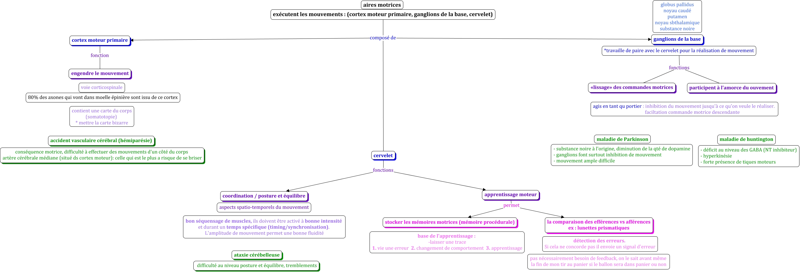 Cette carte de concepts créée avec IHMC CmapTools traite de: aires motrices 2.0, cervelet fonctions apprentissage moteur, *travaille de paire avec le cervelet pour la réalisation de mouvement fonctions participent à l'amorce du ouvement, exécutent les mouvements : (cortex moteur primaire, ganglions de la base, cervelet) composé de ganglions de la base, exécutent les mouvements : (cortex moteur primaire, ganglions de la base, cervelet) composé de cervelet, exécutent les mouvements : (cortex moteur primaire, ganglions de la base, cervelet) composé de cortex moteur primaire, apprentissage moteur permet stocker les mémoires motrices (mémoire procédurale), apprentissage moteur permet la comparaison des efférences vs afférences ex : lunettes prismatiques, *travaille de paire avec le cervelet pour la réalisation de mouvement fonctions «lissage» des commandes motrices, cervelet fonctions coordination / posture et équilibre, cortex moteur primaire fonction engendre le mouvement