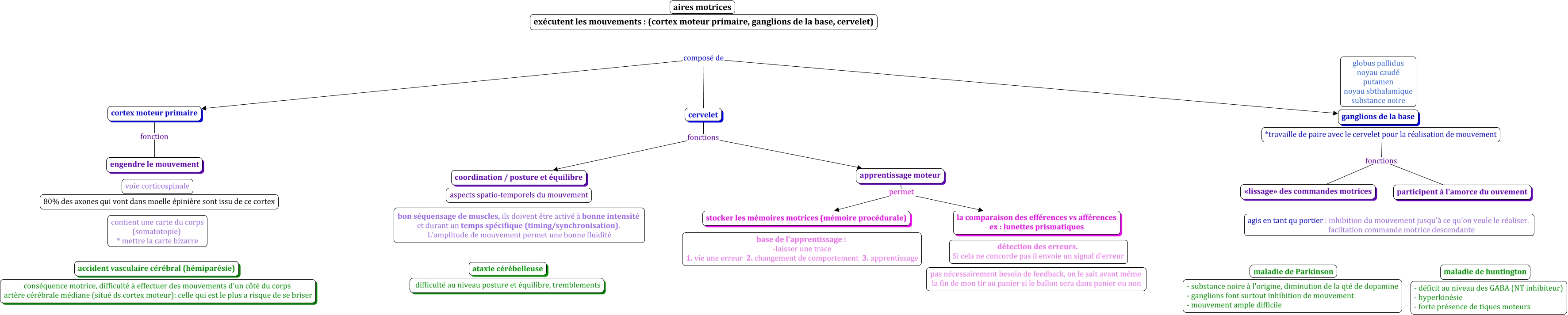 Cette carte de concepts créée avec IHMC CmapTools traite de: aires motrices, cervelet fonctions apprentissage moteur, *travaille de paire avec le cervelet pour la réalisation de mouvement fonctions participent à l'amorce du ouvement, exécutent les mouvements : (cortex moteur primaire, ganglions de la base, cervelet) composé de ganglions de la base, exécutent les mouvements : (cortex moteur primaire, ganglions de la base, cervelet) composé de cervelet, exécutent les mouvements : (cortex moteur primaire, ganglions de la base, cervelet) composé de cortex moteur primaire, apprentissage moteur permet stocker les mémoires motrices (mémoire procédurale), apprentissage moteur permet la comparaison des efférences vs afférences ex : lunettes prismatiques, *travaille de paire avec le cervelet pour la réalisation de mouvement fonctions «lissage» des commandes motrices, cervelet fonctions coordination / posture et équilibre, cortex moteur primaire fonction engendre le mouvement
