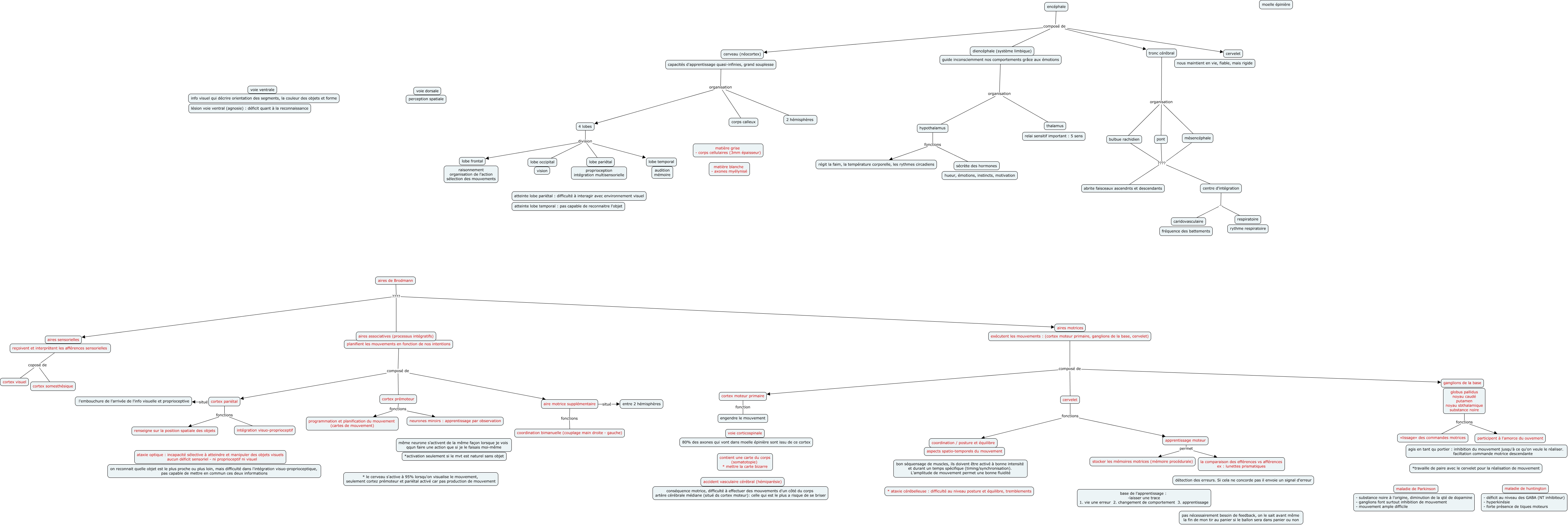 Cette carte de concepts créée avec IHMC CmapTools traite de: division encéphale et aire de broodman, cortex pariétal fonctions intégration visuo-proprioceptif, cervelet fonctions apprentissage moteur, tronc cérébral organisation pont, reçoivent et interprètent les afférences sensorielles coposé de cortex visuel, aire motrice supplémentaire fonctions coordination bimanuelle (couplage main droite - gauche), capacités d'apprentissage quasi-infinies, grand souplesse organisation 4 lobes, aire motrice supplémentaire situé entre 2 hémisphères, apprentissage moteur permet la comparaison des efférences vs afférences ex : lunettes prismatiques, capacités d'apprentissage quasi-infinies, grand souplesse organisation 2 hémisphères, tronc cérébral organisation mésencéphale, bulbue rachidien ???? abrite faisceaux ascendnts et descendants, pont ???? abrite faisceaux ascendnts et descendants, hypothalamus fonctions régit la faim, la température corporelle, les rythmes circadiens, globus pallidus noyau caudé putamen noyau sbthalamique substance noire fonctions participent à l'amorce du ouvement, guide inconsciemment nos comportements grâce aux émotions organisation hypothalamus, cortex pariétal situé l'embouchure de l'arrivée de l'info visuelle et proprioceptive, planifient les mouvements en fonction de nos intentions composé de cortex pariétal, hypothalamus fonctions sécrète des hormones, encéphale composé de cervelet, encéphale composé de diencéphale (système limbique)