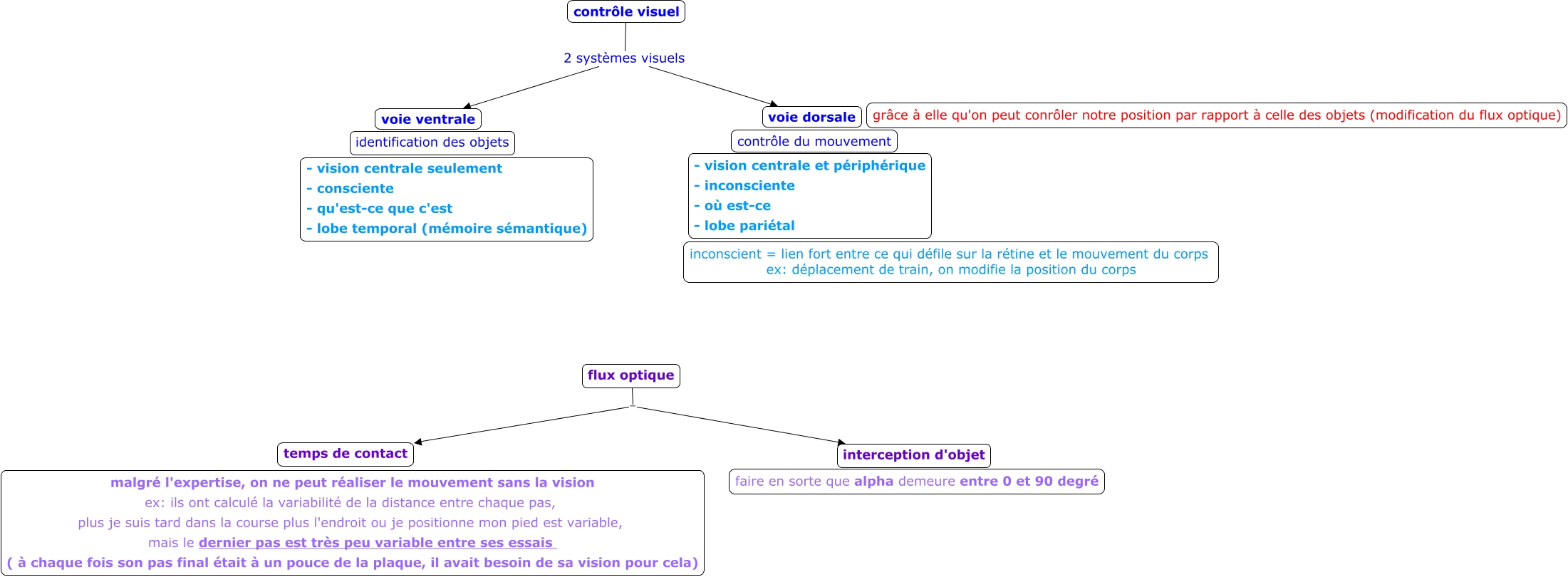 Cette carte de concepts créée avec IHMC CmapTools traite de: contrôle visuel, flux optique - temps de contact, contrôle visuel 2 systèmes visuels voie dorsale, flux optique - interception d'objet, contrôle visuel 2 systèmes visuels voie ventrale