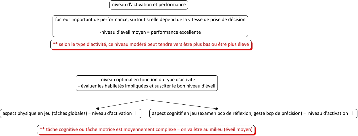 Cette carte de concepts créée avec IHMC CmapTools traite de: niveau d'activité et performance, - niveau optimal en fonction du type d'activité - évaluer les habiletés impliquées et susciter le bon niveau d'éveil - aspect physique en jeu (tâches globales) = niveau d'activation l, - niveau optimal en fonction du type d'activité - évaluer les habiletés impliquées et susciter le bon niveau d'éveil - aspect cognitif en jeu (examen bcp de réflexion, geste bcp de précision) = niveau d'activation l