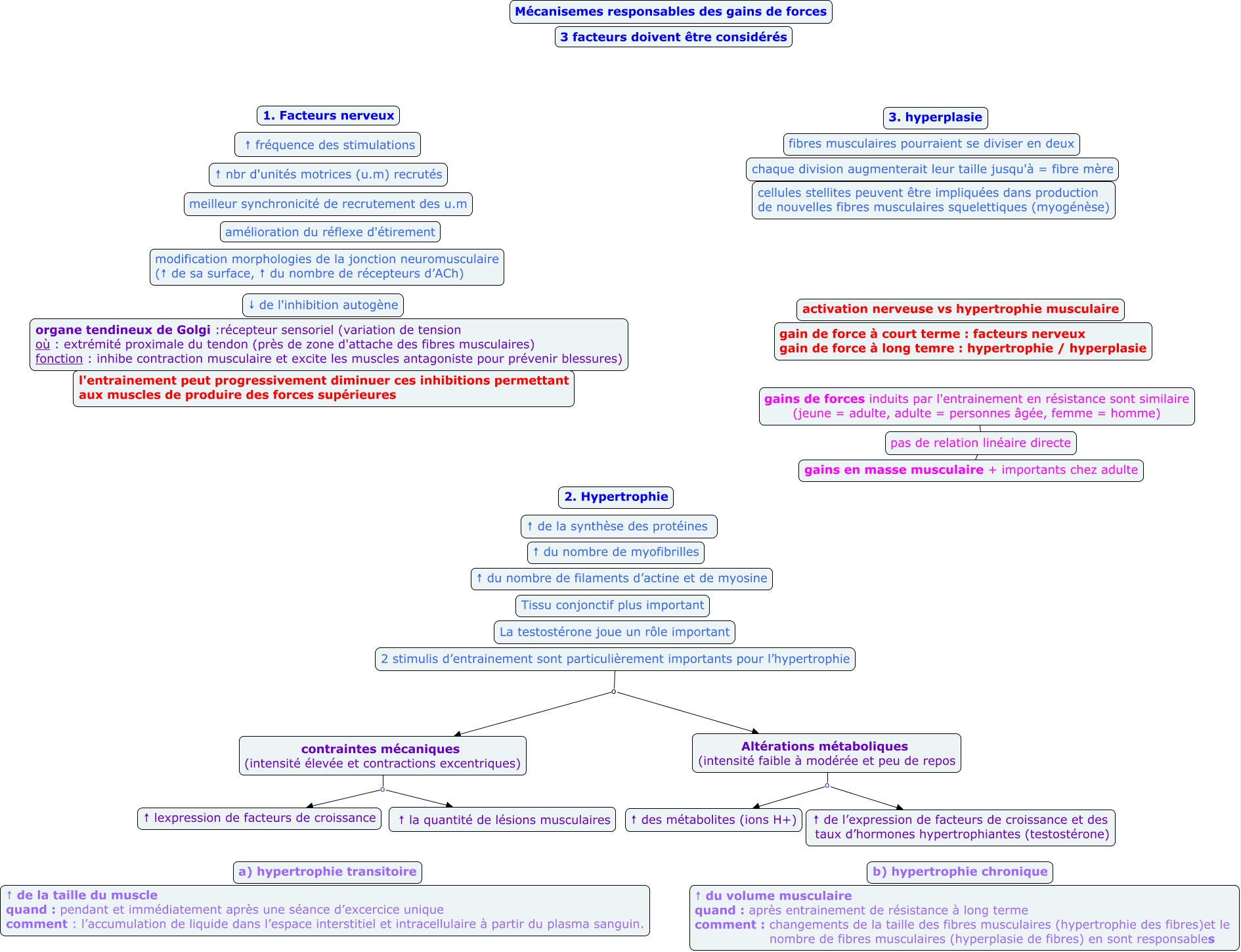 Cette carte de concepts créée avec IHMC CmapTools traite de: mécanismes responsables des gains de forces, 2 stimulis d’entrainement sont particulièrement importants pour l’hypertrophie o contraintes mécaniques (intensité élevée et contractions excentriques), gains de forces induits par l'entrainement en résistance sont similaire (jeune = adulte, adulte = personnes âgée, femme = homme) ???? pas de relation linéaire directe, Altérations métaboliques (intensité faible à modérée et peu de repos o ↑ de l’expression de facteurs de croissance et des taux d’hormones hypertrophiantes (testostérone), Altérations métaboliques (intensité faible à modérée et peu de repos o ↑ des métabolites (ions H+), contraintes mécaniques (intensité élevée et contractions excentriques) o ↑ la quantité de lésions musculaires, 2 stimulis d’entrainement sont particulièrement importants pour l’hypertrophie o Altérations métaboliques (intensité faible à modérée et peu de repos, gains en masse musculaire + importants chez adulte ???? pas de relation linéaire directe, contraintes mécaniques (intensité élevée et contractions excentriques) o ↑ lexpression de facteurs de croissance