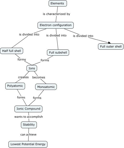 This Concept Map, created with IHMC CmapTools, has information related to: Ionic Compound, Ions creates Polyatomic, Ions becomes Monoatomic, Stability can achieve Lowest Potential Energy, Electron configuration is divided into Full subshell, Full subshell forms Ions, Half full shell forms Ions, Electron configuration is divided into Full outer shell, Elements is characterized by Electron configuration, Monoatomic forms Ionic Compound, Ionic Compound wants to accomplish Stability, Polyatomic forms Ionic Compound, Electron configuration is divided into Half full shell