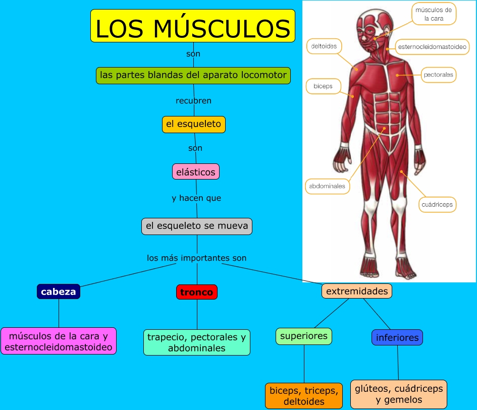 Este Cmap, tiene información relacionada con: Los músculos, inferiores glúteos, cuádriceps y gemelos, el esqueleto se mueva los más importantes son cabeza, el esqueleto se mueva los más importantes son tronco, tronco trapecio, pectorales y abdominales, extremidades superiores, el esqueleto se mueva los más importantes son extremidades, cabeza músculos de la cara y esternocleidomastoideo, superiores biceps, triceps, deltoides, elásticos y hacen que el esqueleto se mueva, las partes blandas del aparato locomotor recubren el esqueleto, el esqueleto son elásticos, extremidades inferiores, LOS MÚSCULOS son las partes blandas del aparato locomotor