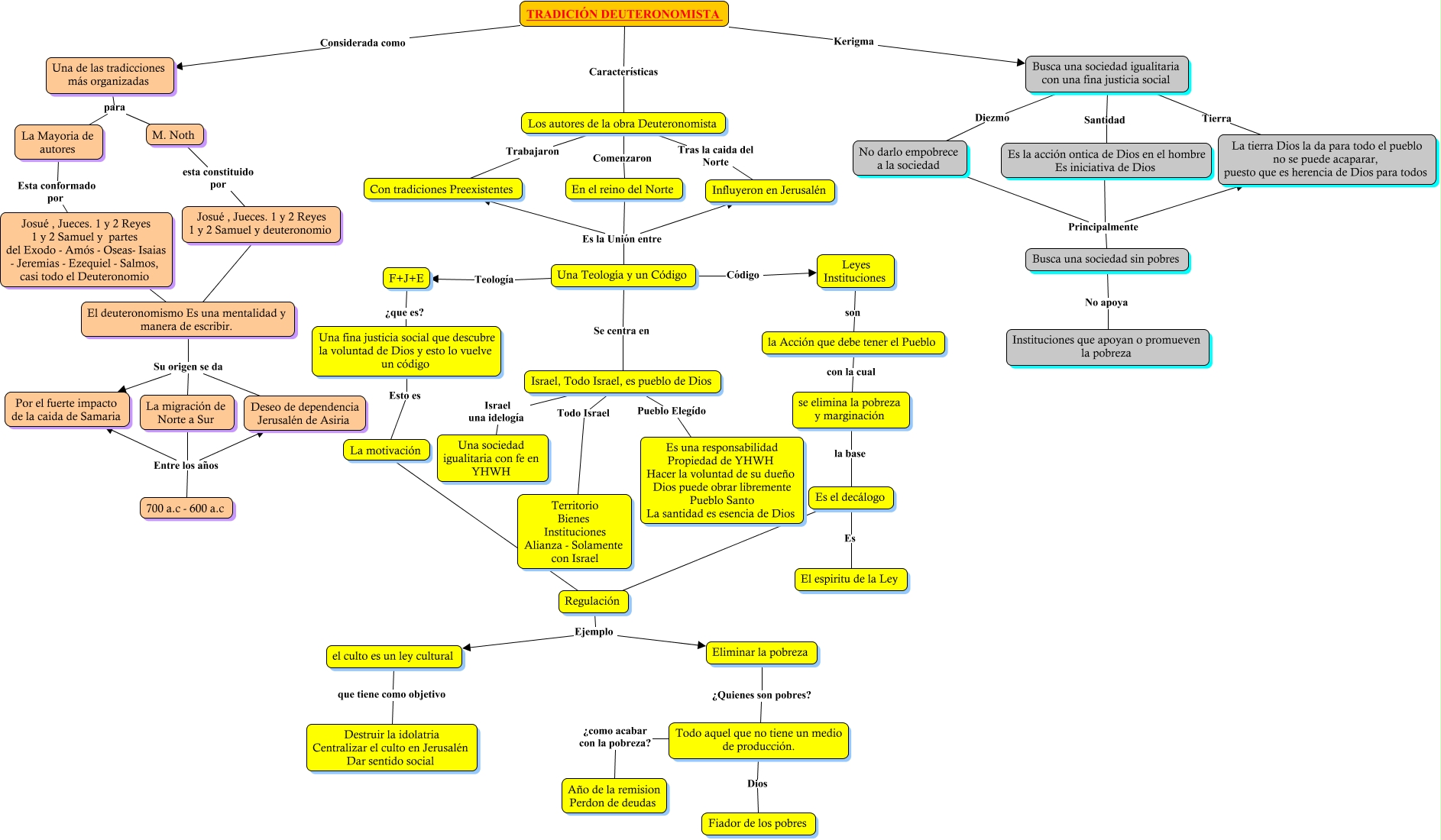 Este Cmap, tiene información relacionada con: DEUTERONOMISTA, Una Teología y un Código Código Leyes Instituciones, Los autores de la obra Deuteronomista Comenzaron En el reino del Norte, Busca una sociedad sin pobres Principalmente La tierra Dios la da para todo el pueblo no se puede acaparar, puesto que es herencia de Dios para todos, La migración de Norte a Sur Entre los años Deseo de dependencia Jerusalén de Asiria, Los autores de la obra Deuteronomista Tras la caida del Norte Influyeron en Jerusalén, Busca una sociedad sin pobres Principalmente ????, En el reino del Norte Es la Unión entre Con tradiciones Preexistentes, Regulación ???? Es el decálogo, Busca una sociedad igualitaria con una fina justicia social Diezmo No darlo empobrece a la sociedad, El deuteronomismo Es una mentalidad y manera de escribir. ???? Josué , Jueces. 1 y 2 Reyes 1 y 2 Samuel y deuteronomio, el culto es un ley cultural que tiene como objetivo Destruir la idolatria Centralizar el culto en Jerusalén Dar sentido social, F+J+E ¿que es? Una fina justicia social que descubre la voluntad de Dios y esto lo vuelve un código, Israel, Todo Israel, es pueblo de Dios Todo Israel Territorio Bienes Instituciones Alianza - Solamente con Israel, M. Noth esta constituido por Josué , Jueces. 1 y 2 Reyes 1 y 2 Samuel y deuteronomio, El deuteronomismo Es una mentalidad y manera de escribir. Su origen se da Por el fuerte impacto de la caida de Samaria, TRADICIÓN DEUTERONOMISTA Características Los autores de la obra Deuteronomista, Busca una sociedad igualitaria con una fina justicia social Tierra La tierra Dios la da para todo el pueblo no se puede acaparar, puesto que es herencia de Dios para todos, TRADICIÓN DEUTERONOMISTA Considerada como Una de las tradicciones más organizadas, Una de las tradicciones más organizadas para La Mayoria de autores, Busca una sociedad sin pobres Principalmente ????