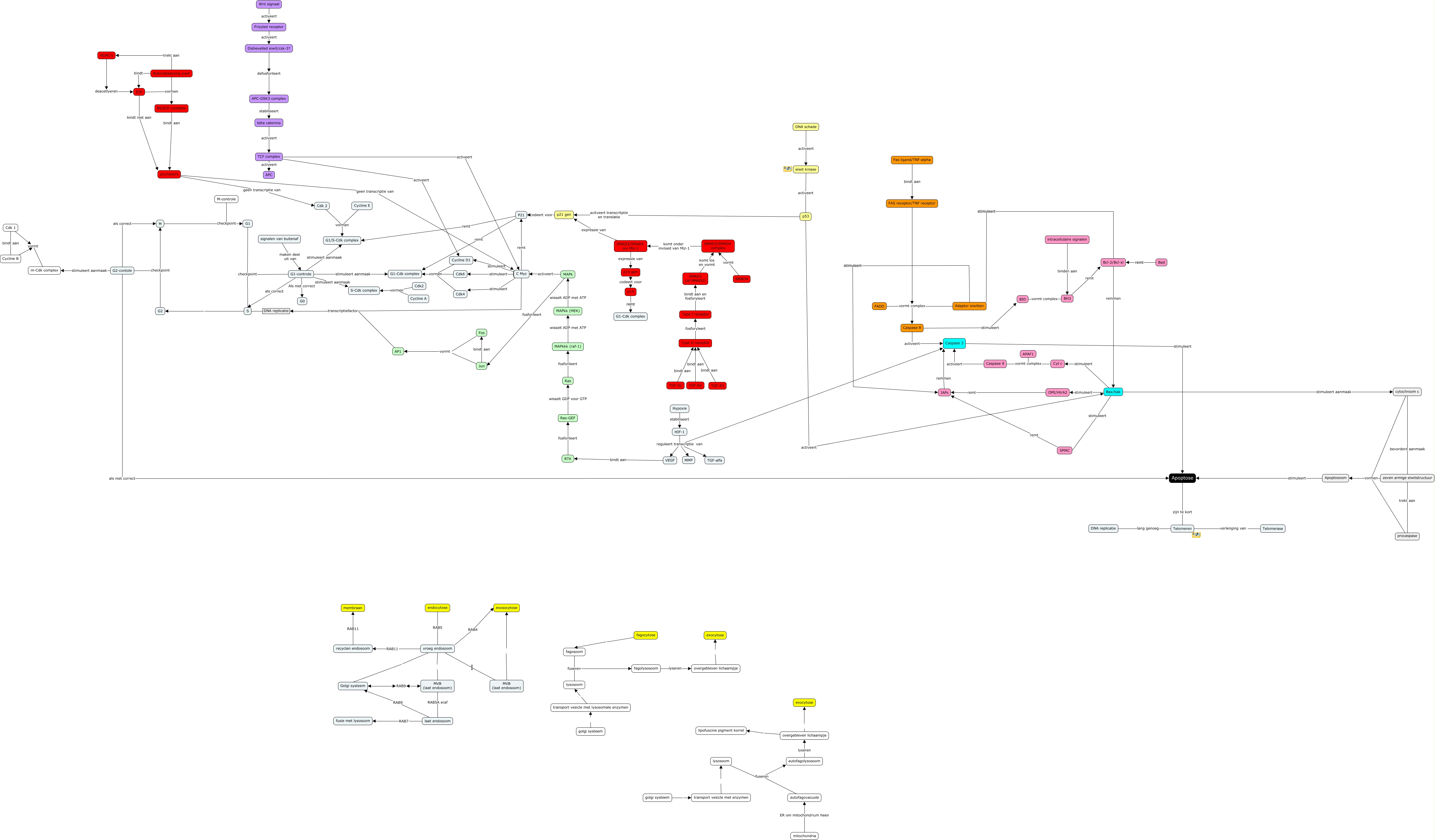 Deze Concept Map heeft informatie gerelateerd aan: cmap 1.8, Ras fosforileert MAPkkk (raf-1), G1-controle als correct S, Cdk2 vormen S-Cdk complex, TCF complex activeert C Myc, Bad remt Bcl-2/Bcl-xl, DNA schade activeert eiwit kinase, Retinoblastoma eiwit vormen Rb/E2F-complex, Type I receptor bindt aan en fosforyleert SMAD3 (of SMAD2), cytochroom c bevorderd aanmaak zeven armige eiwitstructuur, SMAD3/SMAD4 complex komt onder invloed van Miz-1 SMAD3/SMAD4 oiv Miz-1, Adaptor eiwitten stimuleert Bcl-2/Bcl-xl, P21 remt G1/S-Cdk complex, C Myc stimuleert Cdk6, Bcl-2/Bcl-xl remmen Bax/bak, p53 activeert Bax/bak, Telomeren zijn te kort Apoptose, golgi systeem transport vesicle met lysosomale enzymen, E2F vormen Rb/E2F-complex, G1-controle stimuleert aanmaak G1/S-Cdk complex, autofagolysosoom lyseren overgebleven lichaampje