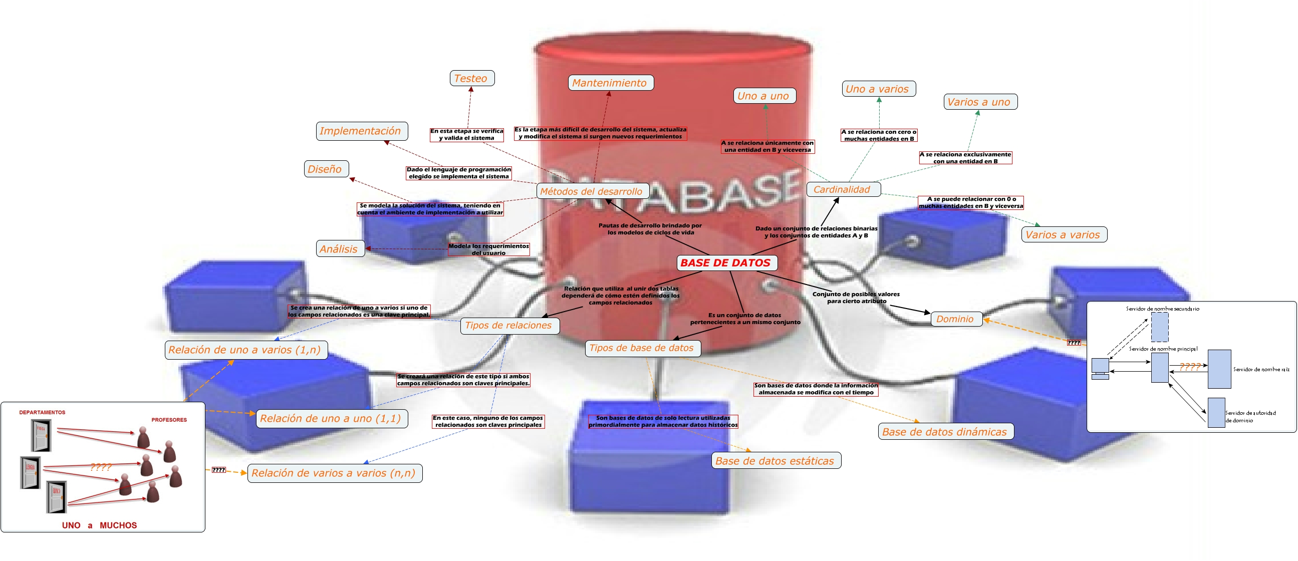 Este Cmap, tiene información relacionada con: Base de datos, Tipos de relaciones Se crea una relación de uno a varios si uno de los campos relacionados es una clave principal. Relación de uno a varios (1,n), Métodos del desarrollo Es la etapa más difícil de desarrollo del sistema, actualiza y modifica el sistema si surgen nuevos requerimientos Mantenimiento, BASE DE DATOS Dado un conjunto de relaciones binarias y los conjuntos de entidades A y B Cardinalidad, Tipos de base de datos Son bases de datos donde la información almacenada se modifica con el tiempo Base de datos dinámicas, Tipos de relaciones En este caso, ninguno de los campos relacionados son claves principales Relación de varios a varios (n,n), Métodos del desarrollo En esta etapa se verifica y valida el sistema Testeo, Cardinalidad A se relaciona con cero o muchas entidades en B Uno a varios, Cardinalidad A se relaciona únicamente con una entidad en B y viceversa Uno a uno, ???? ???? Relación de varios a varios (n,n), ???? ???? Dominio, BASE DE DATOS Es un conjunto de datos pertenecientes a un mismo conjunto Tipos de base de datos, Tipos de relaciones Se creará una relación de este tipo si ambos campos relacionados son claves principales. Relación de uno a uno (1,1), ???? ???? Relación de uno a varios (1,n), Cardinalidad A se puede relacionar con 0 o muchas entidades en B y viceversa Varios a varios, ???? ???? Relación de uno a uno (1,1), Métodos del desarrollo Modela los requerimientos del usuario Análisis, Métodos del desarrollo Dado el lenguaje de programación elegido se implementa el sistema Implementación, Tipos de base de datos Son bases de datos de solo lectura utilizadas primordialmente para almacenar datos históricos Base de datos estáticas, Métodos del desarrollo Se modela la solución del sistema, teniendo en cuenta el ambiente de implementación a utilizar Diseño, BASE DE DATOS Conjunto de posibles valores para cierto atributo Dominio