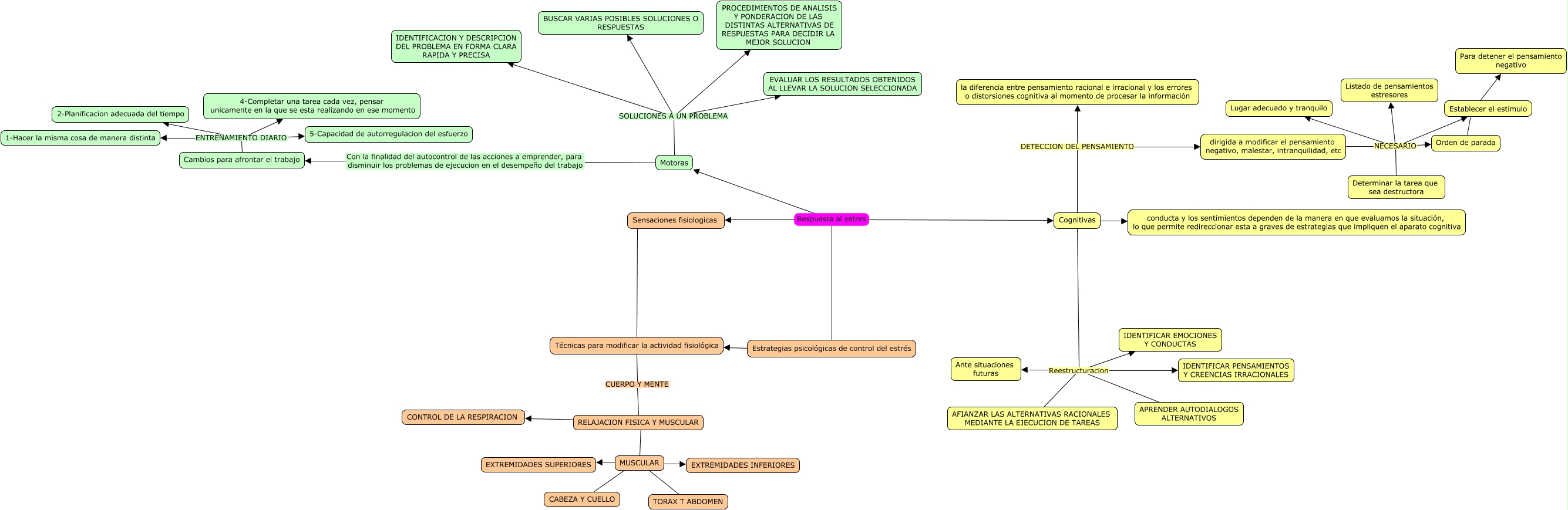 Este Cmap, tiene información relacionada con: capitulo 3, MUSCULAR ???? EXTREMIDADES INFERIORES, Cognitivas Reestructuracion IDENTIFICAR PENSAMIENTOS Y CREENCIAS IRRACIONALES, Motoras SOLUCIONES A UN PROBLEMA PROCEDIMIENTOS DE ANALISIS Y PONDERACION DE LAS DISTINTAS ALTERNATIVAS DE RESPUESTAS PARA DECIDIR LA MEJOR SOLUCION, Motoras SOLUCIONES A UN PROBLEMA EVALUAR LOS RESULTADOS OBTENIDOS AL LLEVAR LA SOLUCION SELECCIONADA, Cambios para afrontar el trabajo ENTRENAMIENTO DIARIO 5-Capacidad de autorregulacion del esfuerzo, Motoras SOLUCIONES A UN PROBLEMA BUSCAR VARIAS POSIBLES SOLUCIONES O RESPUESTAS, dirigida a modificar el pensamiento negativo, malestar, intranquilidad, etc NECESARIO Establecer el estímulo, Cognitivas DETECCION DEL PENSAMIENTO la diferencia entre pensamiento racional e irracional y los errores o distorsiones cognitiva al momento de procesar la información, dirigida a modificar el pensamiento negativo, malestar, intranquilidad, etc NECESARIO Lugar adecuado y tranquilo, Orden de parada ???? Para detener el pensamiento negativo, dirigida a modificar el pensamiento negativo, malestar, intranquilidad, etc NECESARIO Listado de pensamientos estresores, RELAJACION FISICA Y MUSCULAR ???? MUSCULAR, Cambios para afrontar el trabajo ENTRENAMIENTO DIARIO 1-Hacer la misma cosa de manera distinta, Cognitivas Reestructuracion Ante situaciones futuras, Estrategias psicológicas de control del estrés ???? Técnicas para modificar la actividad fisiológica, MUSCULAR ???? CABEZA Y CUELLO, Estrategias psicológicas de control del estrés Respuesta al estres Cognitivas, Estrategias psicológicas de control del estrés Respuesta al estres Motoras, Motoras Con la finalidad del autocontrol de las acciones a emprender, para disminuir los problemas de ejecucion en el desempeño del trabajo Cambios para afrontar el trabajo, MUSCULAR ???? TORAX T ABDOMEN