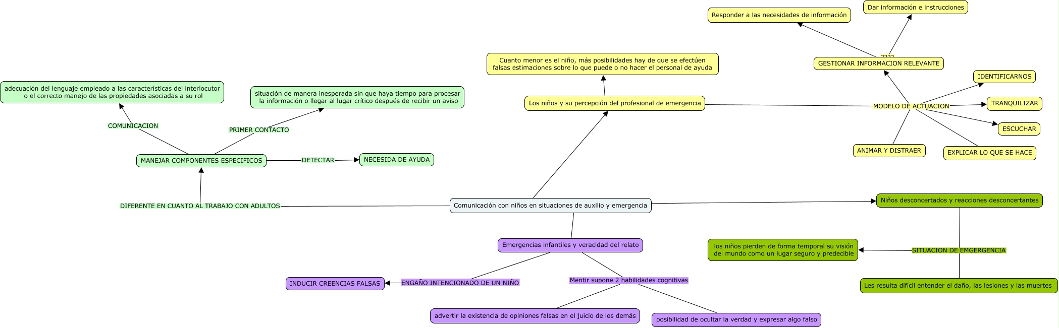 Este Cmap, tiene información relacionada con: capitulo 6, Los niños y su percepción del profesional de emergencia MODELO DE ACTUACION IDENTIFICARNOS, Comunicación con niños en situaciones de auxilio y emergencia ???? Los niños y su percepción del profesional de emergencia, MANEJAR COMPONENTES ESPECIFICOS COMUNICACION adecuación del lenguaje empleado a las características del interlocutor o el correcto manejo de las propiedades asociadas a su rol, MANEJAR COMPONENTES ESPECIFICOS DETECTAR NECESIDA DE AYUDA, Comunicación con niños en situaciones de auxilio y emergencia ???? Emergencias infantiles y veracidad del relato, Los niños y su percepción del profesional de emergencia MODELO DE ACTUACION ESCUCHAR, Emergencias infantiles y veracidad del relato ENGAÑO INTENCIONADO DE UN NIÑO INDUCIR CREENCIAS FALSAS, Los niños y su percepción del profesional de emergencia MODELO DE ACTUACION ANIMAR Y DISTRAER, Niños desconcertados y reacciones desconcertantes SITUACION DE EMGERGENCIA Les resulta difícil entender el daño, las lesiones y las muertes, Los niños y su percepción del profesional de emergencia ???? Cuanto menor es el niño, más posibilidades hay de que se efectúen falsas estimaciones sobre lo que puede o no hacer el personal de ayuda, MANEJAR COMPONENTES ESPECIFICOS PRIMER CONTACTO situación de manera inesperada sin que haya tiempo para procesar la información o llegar al lugar crítico después de recibir un aviso, Emergencias infantiles y veracidad del relato Mentir supone 2 habilidades cognitivas posibilidad de ocultar la verdad y expresar algo falso, Comunicación con niños en situaciones de auxilio y emergencia ???? Niños desconcertados y reacciones desconcertantes, Los niños y su percepción del profesional de emergencia MODELO DE ACTUACION TRANQUILIZAR, Niños desconcertados y reacciones desconcertantes SITUACION DE EMGERGENCIA los niños pierden de forma temporal su visión del mundo como un lugar seguro y predecible, Comunicación con niños en situaciones de auxilio y emergencia DIFERENTE EN CUANTO AL TRABAJO CON ADULTOS MANEJAR COMPONENTES ESPECIFICOS, Los niños y su percepción del profesional de emergencia MODELO DE ACTUACION GESTIONAR INFORMACION RELEVANTE, Los niños y su percepción del profesional de emergencia MODELO DE ACTUACION EXPLICAR LO QUE SE HACE, GESTIONAR INFORMACION RELEVANTE ???? Responder a las necesidades de información, GESTIONAR INFORMACION RELEVANTE ???? Dar información e instrucciones