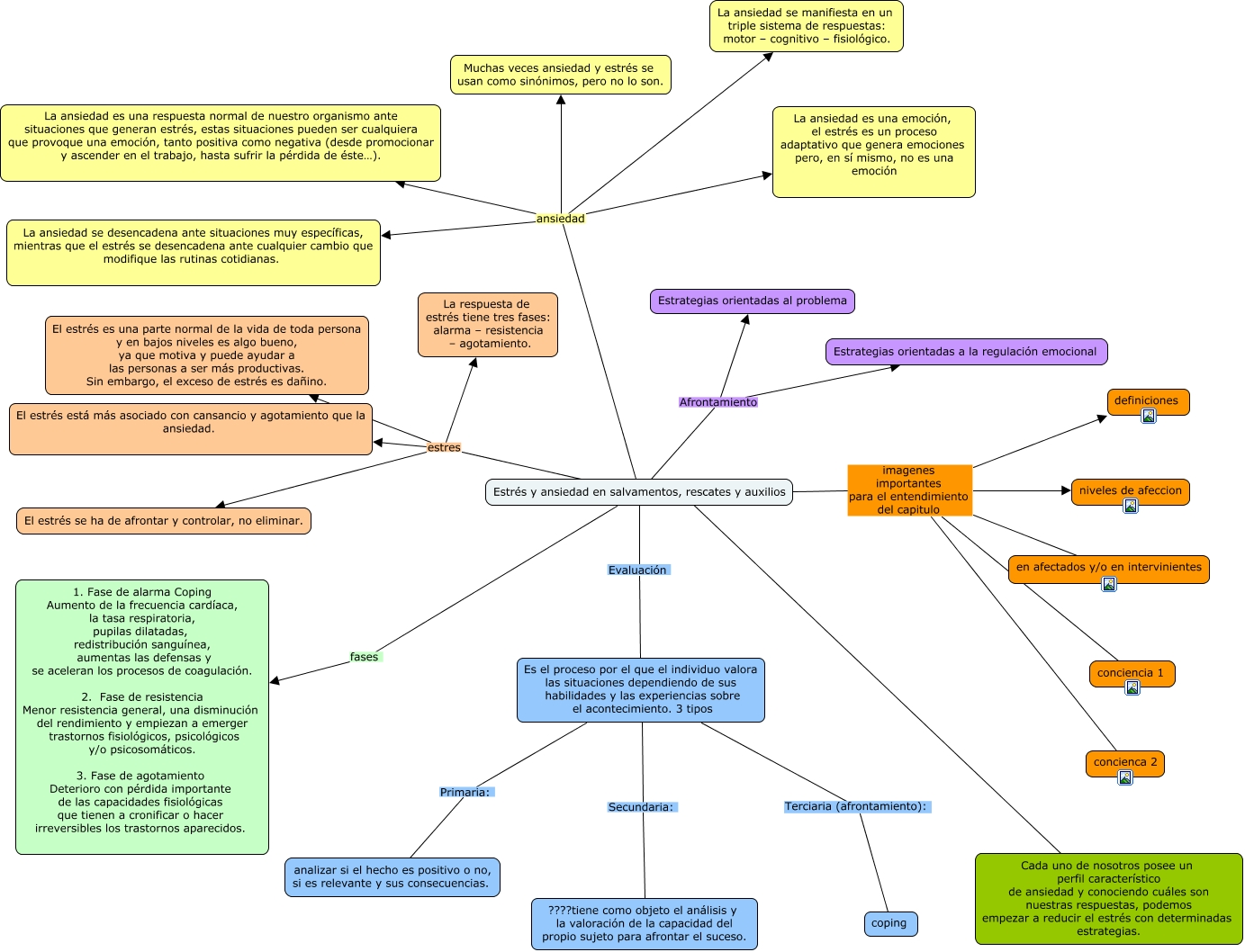 Este Cmap, tiene información relacionada con: capitulo 2, Estrés y ansiedad en salvamentos, rescates y auxilios fases 1. Fase de alarma Coping Aumento de la frecuencia cardíaca, la tasa respiratoria, pupilas dilatadas, redistribución sanguínea, aumentas las defensas y se aceleran los procesos de coagulación. 2. Fase de resistencia Menor resistencia general, una disminución del rendimiento y empiezan a emerger trastornos fisiológicos, psicológicos y/o psicosomáticos. 3. Fase de agotamiento Deterioro con pérdida importante de las capacidades fisiológicas que tienen a cronificar o hacer irreversibles los trastornos aparecidos., Estrés y ansiedad en salvamentos, rescates y auxilios ansiedad La ansiedad se desencadena ante situaciones muy específicas, mientras que el estrés se desencadena ante cualquier cambio que modifique las rutinas cotidianas., Es el proceso por el que el individuo valora las situaciones dependiendo de sus habilidades y las experiencias sobre el acontecimiento. 3 tipos Secundaria: ????tiene como objeto el análisis y la valoración de la capacidad del propio sujeto para afrontar el suceso., Es el proceso por el que el individuo valora las situaciones dependiendo de sus habilidades y las experiencias sobre el acontecimiento. 3 tipos Terciaria (afrontamiento): coping, Estrés y ansiedad en salvamentos, rescates y auxilios ansiedad La ansiedad se manifiesta en un triple sistema de respuestas: motor – cognitivo – fisiológico., Estrés y ansiedad en salvamentos, rescates y auxilios imagenes importantes para el entendimiento del capitulo niveles de afeccion, Estrés y ansiedad en salvamentos, rescates y auxilios estres La respuesta de estrés tiene tres fases: alarma – resistencia – agotamiento., Estrés y ansiedad en salvamentos, rescates y auxilios imagenes importantes para el entendimiento del capitulo definiciones, Estrés y ansiedad en salvamentos, rescates y auxilios estres El estrés es una parte normal de la vida de toda persona y en bajos niveles es algo bueno, ya que motiva y puede ayudar a las personas a ser más productivas. Sin embargo, el exceso de estrés es dañino., Estrés y ansiedad en salvamentos, rescates y auxilios estres El estrés está más asociado con cansancio y agotamiento que la ansiedad., Estrés y ansiedad en salvamentos, rescates y auxilios ansiedad La ansiedad es una emoción, el estrés es un proceso adaptativo que genera emociones pero, en sí mismo, no es una emoción, Estrés y ansiedad en salvamentos, rescates y auxilios Evaluación Es el proceso por el que el individuo valora las situaciones dependiendo de sus habilidades y las experiencias sobre el acontecimiento. 3 tipos, Estrés y ansiedad en salvamentos, rescates y auxilios ansiedad La ansiedad es una respuesta normal de nuestro organismo ante situaciones que generan estrés, estas situaciones pueden ser cualquiera que provoque una emoción, tanto positiva como negativa (desde promocionar y ascender en el trabajo, hasta sufrir la pérdida de éste…)., Estrés y ansiedad en salvamentos, rescates y auxilios imagenes importantes para el entendimiento del capitulo en afectados y/o en intervinientes, Estrés y ansiedad en salvamentos, rescates y auxilios estres El estrés se ha de afrontar y controlar, no eliminar., Estrés y ansiedad en salvamentos, rescates y auxilios imagenes importantes para el entendimiento del capitulo concienca 2, Estrés y ansiedad en salvamentos, rescates y auxilios Afrontamiento Estrategias orientadas al problema, Estrés y ansiedad en salvamentos, rescates y auxilios Afrontamiento Estrategias orientadas a la regulación emocional, Es el proceso por el que el individuo valora las situaciones dependiendo de sus habilidades y las experiencias sobre el acontecimiento. 3 tipos Primaria: analizar si el hecho es positivo o no, si es relevante y sus consecuencias., Estrés y ansiedad en salvamentos, rescates y auxilios ansiedad Muchas veces ansiedad y estrés se usan como sinónimos, pero no lo son.