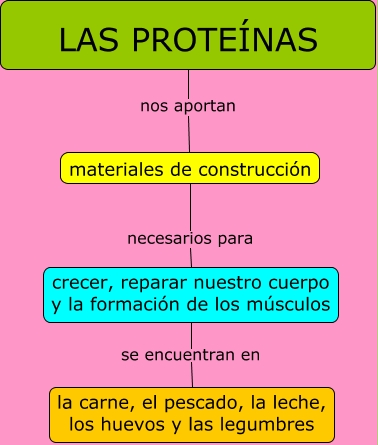 Este Cmap, tiene información relacionada con: Las proteínas, LAS PROTEÍNAS nos aportan materiales de construcción, materiales de construcción necesarios para crecer, reparar nuestro cuerpo y la formación de los músculos, crecer, reparar nuestro cuerpo y la formación de los músculos se encuentran en la carne, el pescado, la leche, los huevos y las legumbres