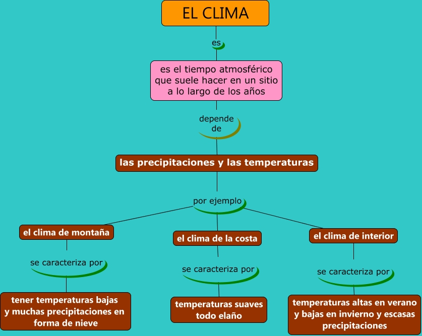 Este Cmap, tiene información relacionada con: El clima, las precipitaciones y las temperaturas por ejemplo el clima de la costa, las precipitaciones y las temperaturas por ejemplo el clima de montaña, EL CLIMA es es el tiempo atmosférico que suele hacer en un sitio a lo largo de los años, el clima de montaña se caracteriza por tener temperaturas bajas y muchas precipitaciones en forma de nieve, es el tiempo atmosférico que suele hacer en un sitio a lo largo de los años depende de las precipitaciones y las temperaturas, el clima de interior se caracteriza por temperaturas altas en verano y bajas en invierno y escasas precipitaciones, las precipitaciones y las temperaturas por ejemplo el clima de interior, el clima de la costa se caracteriza por temperaturas suaves todo elaño