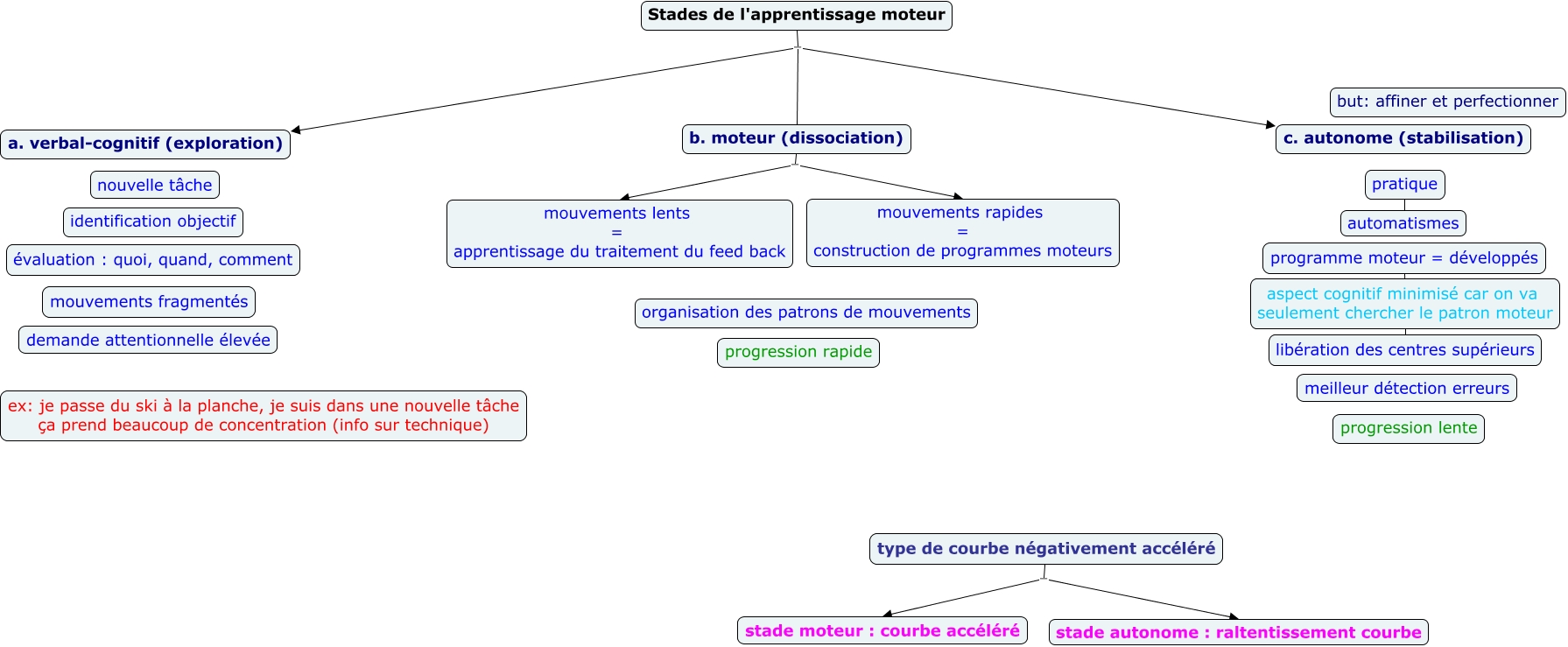 Cette carte de concepts créée avec IHMC CmapTools traite de: stade de l'apprentissage moteur, Stades de l'apprentissage moteur - a. verbal-cognitif (exploration), programme moteur = développés - aspect cognitif minimisé car on va seulement chercher le patron moteur, Stades de l'apprentissage moteur - c. autonome (stabilisation), b. moteur (dissociation) - mouvements rapides = construction de programmes moteurs, type de courbe négativement accéléré - stade autonome : raltentissement courbe, pratique - automatismes, b. moteur (dissociation) - mouvements lents = apprentissage du traitement du feed back, Stades de l'apprentissage moteur - b. moteur (dissociation), type de courbe négativement accéléré - stade moteur : courbe accéléré, aspect cognitif minimisé car on va seulement chercher le patron moteur - libération des centres supérieurs