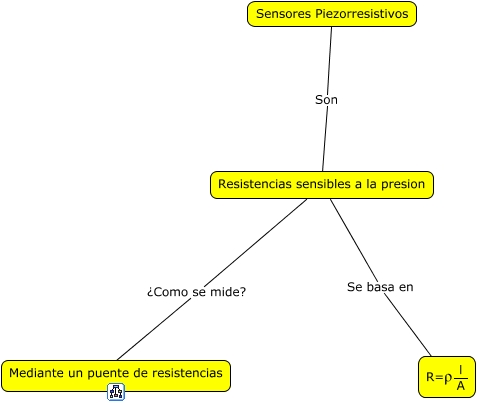Este Cmap, tiene información relacionada con: Piezorresistivos, Resistencias sensibles a la presion Se basa en <math xmlns="http://www.w3.org/1998/Math/MathML"> <mrow> <mtext> R=�? </mtext> <mfrac> <mtext> l </mtext> <mtext> A </mtext> </mfrac> </mrow> </math>, Resistencias sensibles a la presion ¿Como se mide? Mediante un puente de resistencias, Sensores Piezorresistivos Son Resistencias sensibles a la presion