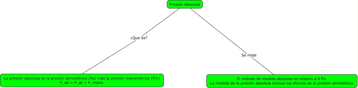 Este Cmap, tiene información relacionada con: presion absoluta, Presión Absoluta ¿Que es? La presión absoluta es la presión atmosférica (Pa) más la presión manométrica (Pm) P_ab = P_at + P_mano., Presión Absoluta Se mide El método de medida absoluta es relativo a 0 Pa. La medida de la presión absoluta incluye los efectos de la presión atmosférica.