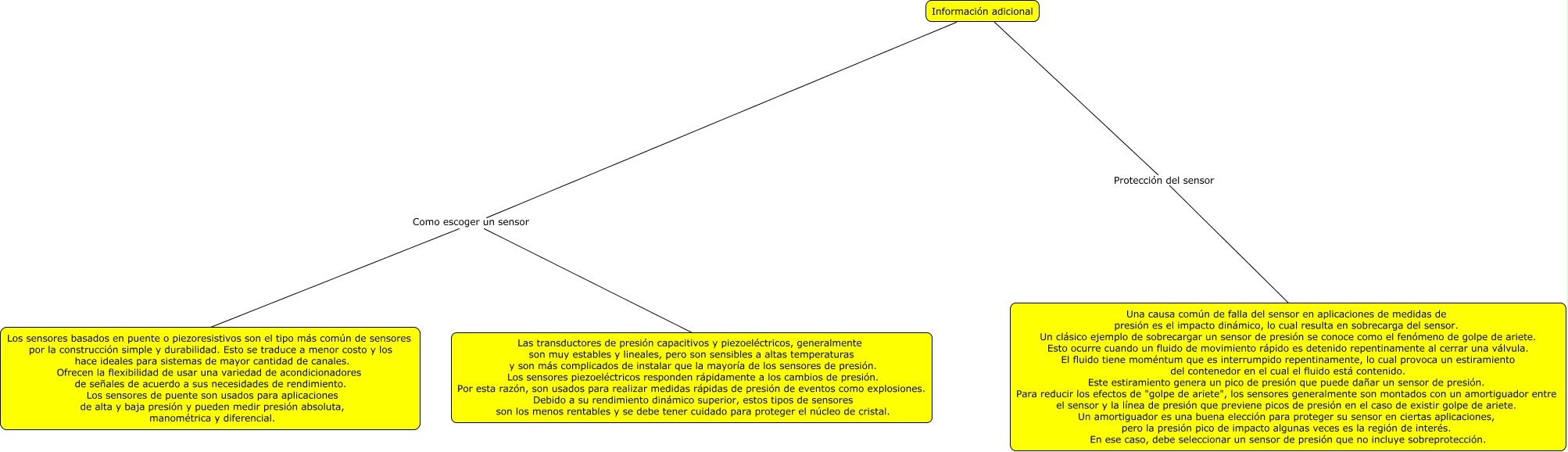 Este Cmap, tiene información relacionada con: informacion adicional, Información adicional Como escoger un sensor Los sensores basados en puente o piezoresistivos son el tipo más común de sensores por la construcción simple y durabilidad. Esto se traduce a menor costo y los hace ideales para sistemas de mayor cantidad de canales. Ofrecen la flexibilidad de usar una variedad de acondicionadores de señales de acuerdo a sus necesidades de rendimiento. Los sensores de puente son usados para aplicaciones de alta y baja presión y pueden medir presión absoluta, manométrica y diferencial., Información adicional Protección del sensor Una causa común de falla del sensor en aplicaciones de medidas de presión es el impacto dinámico, lo cual resulta en sobrecarga del sensor. Un clásico ejemplo de sobrecargar un sensor de presión se conoce como el fenómeno de golpe de ariete. Esto ocurre cuando un fluido de movimiento rápido es detenido repentinamente al cerrar una válvula. El fluido tiene moméntum que es interrumpido repentinamente, lo cual provoca un estiramiento del contenedor en el cual el fluido está contenido. Este estiramiento genera un pico de presión que puede dañar un sensor de presión. Para reducir los efectos de "golpe de ariete", los sensores generalmente son montados con un amortiguador entre el sensor y la línea de presión que previene picos de presión en el caso de existir golpe de ariete. Un amortiguador es una buena elección para proteger su sensor en ciertas aplicaciones, pero la presión pico de impacto algunas veces es la región de interés. En ese caso, debe seleccionar un sensor de presión que no incluye sobreprotección., Información adicional Como escoger un sensor Las transductores de presión capacitivos y piezoeléctricos, generalmente son muy estables y lineales, pero son sensibles a altas temperaturas y son más complicados de instalar que la mayoría de los sensores de presión. Los sensores piezoeléctricos responden rápidamente a los cambios de presión. Por esta razón, son usados para realizar medidas rápidas de presión de eventos como explosiones. Debido a su rendimiento dinámico superior, estos tipos de sensores son los menos rentables y se debe tener cuidado para proteger el núcleo de cristal.