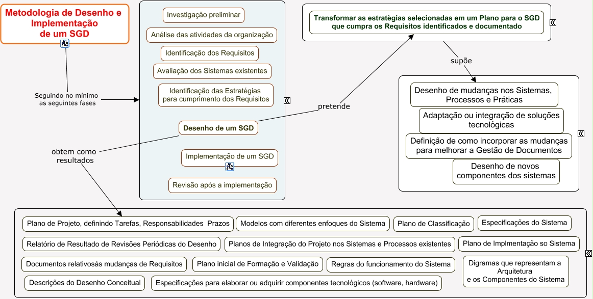 Esse mapa conceitual, produzido no IHMC CmapTools, tem a informação relacionada a: Norma ISO - METODOLOGIA - 06, Desenho de um SGD pretende Transformar as estratégias selecionadas em um Plano para o SGD que cumpra os Requisitos identificados e documentado, ???? supõe Desenho de mudanças nos Sistemas, Processos e Práticas, Desenho de um SGD obtem como resultados Plano de Projeto, definindo Tarefas, Responsabilidades Prazos