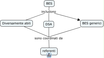 Questa Cmap, creata con IHMC CmapTools, contiene informazioni relative a: AREA DSA BES, Diversamente abili sono coordinati da referenti, BES includono Diversamente abili, BES generici sono coordinati da referenti, BES includono BES generici, BES includono DSA, DSA sono coordinati da referenti