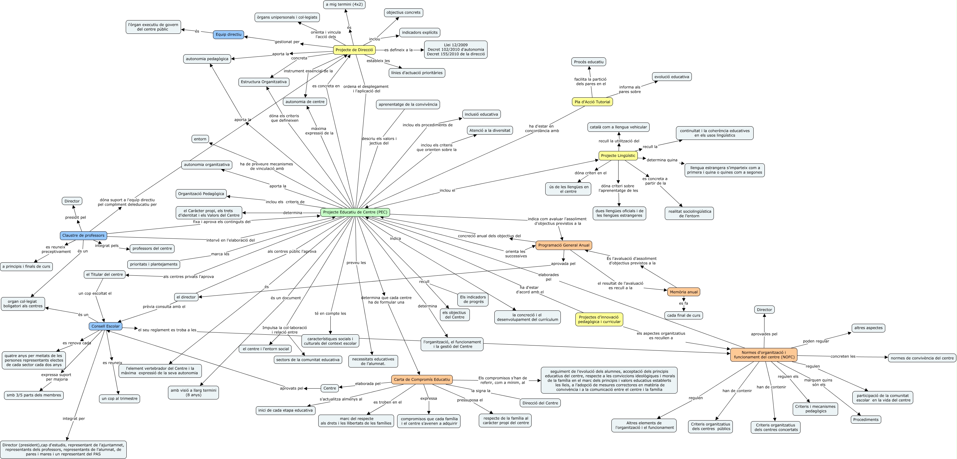 Este Cmap, tiene información relacionada con: PEC, Projecte Lingüístic dóna criteri en el ús de les llengües en el centre, Projecte Educatiu de Centre (PEC) preveu les necessitats educatives de l’alumnat., el director prèvia consulta amb el Consell Escolar, Projecte de Direcció es defineix a la Llei 12/2009 Decret 102/2010 d'autonomia Decret 155/2010 de la direcció, Carta de Compromís Educatiu Els compromisos s’han de referir, com a mínim, al seguiment de l’evolució dels alumnes, acceptació dels principis educatius del centre, respecte a les conviccions ideològiques i morals de la família en el marc dels principis i valors educatius establerts les lleis, a l’adopció de mesures correctores en matèria de convivència i a la comunicació entre el centre i la família, Projecte Educatiu de Centre (PEC) indica la concreció i el desenvolupament del currículum, Projecte Educatiu de Centre (PEC) màxima expressió de la autonomia de centre, Projecte de Direcció estableix les línies d'actuació prioritàries, Normes d'organització i funcionament del centre (NOFC) regulen Altres elements de l'organització i el funcionament, Normes d'organització i funcionament del centre (NOFC) aprovades pel Director, Carta de Compromís Educatiu la signa la Direcció del Centre, Projecte Educatiu de Centre (PEC) determina l'organització, el funcionament i la gestió del Centre, Normes d'organització i funcionament del centre (NOFC) marquen quins són els Procediments, Normes d'organització i funcionament del centre (NOFC) elaborades pel Projecte Educatiu de Centre (PEC), Normes d'organització i funcionament del centre (NOFC) han de contenir Criteris organitzatius dels centres concertats, Projecte Lingüístic es concreta a partir de la realitat sociolingüística de l’entorn, Carta de Compromís Educatiu expressa compromisos que cada família i el centre s’avenen a adquirir, Projecte Educatiu de Centre (PEC) aporta la autonomia pedagògica, Projecte Educatiu de Centre (PEC) determina el Caràcter propi, els trets d'identitat i els Valors del Centre, Claustre de professors intervé en l'elaboració del Projecte Educatiu de Centre (PEC)