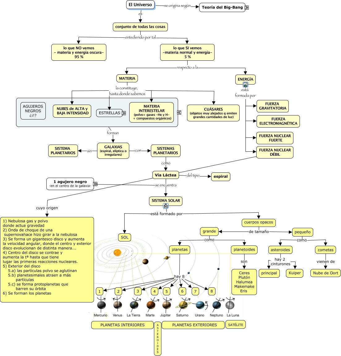 Este Cmap, tiene información relacionada con: 1.2 Cómo se organiza el universo, δ Universo ↓ respecto a la formación del Universo, planetas hay 8 4, ENERGÍA está formada por FUERZA NUCLEAR DÉBIL, GALAXIAS (espiral, elíptica o irregulares) sin SISTEMA PLANETARIOS, ENERGÍA está formada por FUERZA GRAVITATORIA, pequeño como asteroides, agujeros negros es · fuerza de atracción enorme · la gravedad totalmente descontrolada, SISTEMA SOLAR está formado por SOL, fases de expansión y contracción del Universo ahora estamos en fase de expansión, conjunto de todas las cosas entediendo por tal lo que NO vemos - materia y energía oscura- 95 %, δ Universo cte respecto a la formación del Universo, SISTEMA SOLAR está formado por cuerpos opacos, GALAXIAS (espiral, elíptica o irregulares) con SISTEMAS PLANETARIOS, agujeros negros nacen de la muerte de una estrella, Vía Láctea se encuentra SISTEMA SOLAR, agujeros negros Δ · se ven sólo cuando captan energía · un aguejero negro alimentándose es de cualquier color menos negro · lo que el agujero negro no puede digerir lo vómita, planetas hay 8 1, MATERIA la constituye, hasta donde sabemos ESTRELLAS, asteroides hay 2 cinturones Kuiper, ENERGÍA está formada por FUERZA ELECTROMAGNÉTICA