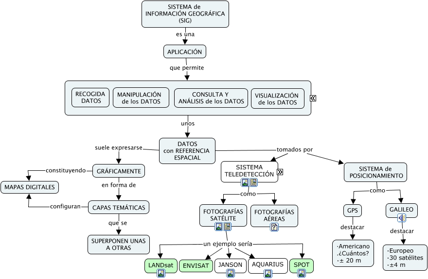 Este Cmap, tiene información relacionada con: 4 y 5 Sistemas de Información Geográfica y Sistemas de Teledetección, FOTOGRAFÍAS SATÉLITE un ejemplo sería LANDsat, SIG metes datos y obtienes un MAPA, GRÁFICAMENTE en forma de CAPAS TEMÁTICAS, GRÁFICAMENTE constituyendo MAPAS DIGITALES, VARIOS ORDENADORES y sale SIG, DATOS con REFERENCIA ESPACIAL tomados por SISTEMA TELEDETECCIÓN, GESTIONAR unos DATOS con REFERENCIA ESPACIAL, SISTEMA TELEDETECCIÓN como FOTOGRAFÍAS AÉREAS, SISTEMA de POSICIONAMIENTO como GPS, SISTEMA TELEDETECCIÓN como FOTOGRAFÍAS SATÉLITE, DATOS con REFERENCIA ESPACIAL tomados por SISTEMA de POSICIONAMIENTO, GLOBE se asemeja a SIG, pero es más DIDÁCTICA, SIG, pero es más DIDÁCTICA cuyo objetivo es MEJORAR MEDIO AMBIENTE, CAPAS TEMÁTICAS configuran MAPAS DIGITALES, DATOS DE NUESTRO SISTEMA los metemos en un VARIOS ORDENADORES, FOTOGRAFÍAS SATÉLITE un ejemplo sería JANSON, SISTEMA de POSICIONAMIENTO como GALILEO, SISTEMA DE TELEDETECIÓN procesa los DATOS DE NUESTRO SISTEMA, GPS destacar ·Americano .¿Cuántos? ⋅± 20 m, GALILEO destacar ⋅Europeo ⋅30 satélites ⋅±4 m