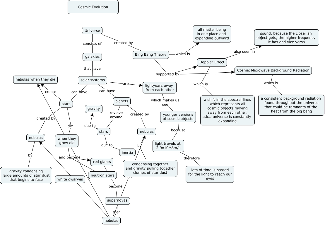 This Concept Map, created with IHMC CmapTools, has information related to: Fall Semester Extra Credit, solar systems can have planets, planets revlove around stars, Doppler Effect which is a shift in the spectral lines which represents all cosmic objects moving away from each other. a.k.a universe is constantly expanding, supernovas then nebulas, younger versions of cosmic objects because light travels at 2.9x10^8m/s, nebulas by condensing together and gravity pulling together clumps of star dust, Bing Bang Theory supported by Cosmic Microwave Background Radiation, nebulas ???? nebulas, stars due to gravity, galaxies that have solar systems, when they grow old and become red giants, light travels at 2.9x10^8m/s therefore lots of time is passed for the light to reach our eyes, stars due to inertia, nebulas ???? nebulas, when they grow old and become neutron stars, solar systems are lightyears away from each other, stars created by nebulas, Bing Bang Theory which is all matter being in one place and expanding outward, Universe consists of galaxies, solar systems can have stars