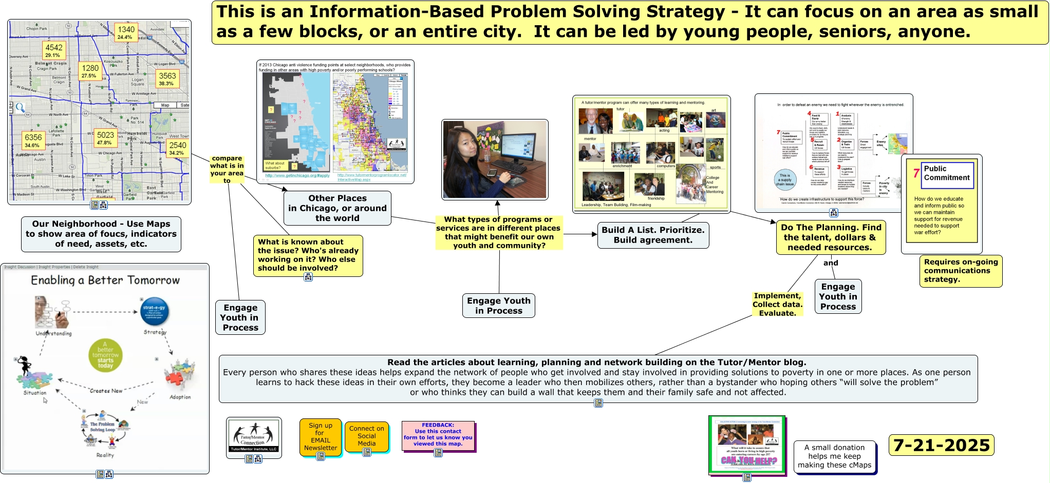 This Concept Map, created with IHMC CmapTools, has information related to: PlanningCycle, Do The Planning. Find the talent, dollars & needed resources. Implement, Collect data. Evaluate. Read the articles about learning, planning and network building on the Tutor/Mentor blog. Every person who shares these ideas helps expand the network of people who get involved and stay involved in providing solutions to poverty in one or more places. As one person learns to hack these ideas in their own efforts, they become a leader who then mobilizes others, rather than a bystander who hoping others “will solve the problem” or who thinks they can build a wall that keeps them and their family safe and not affected., compare what is in your area to What is known about the issue? Who's already working on it? Who else should be involved?, Do The Planning. Find the talent, dollars & needed resources. and Engage Youth in Process, Other Places in Chicago, or around the world What types of programs or services are in different places that might benefit our own youth and community?, Other Places in Chicago, or around the world What types of programs or services are in different places that might benefit our own youth and community? Build A List. Prioritize. Build agreement., compare what is in your area to Engage Youth in Process, Build A List. Prioritize. Build agreement. ???? Do The Planning. Find the talent, dollars & needed resources., compare what is in your area to Other Places in Chicago, or around the world, Other Places in Chicago, or around the world What types of programs or services are in different places that might benefit our own youth and community? Engage Youth in Process
