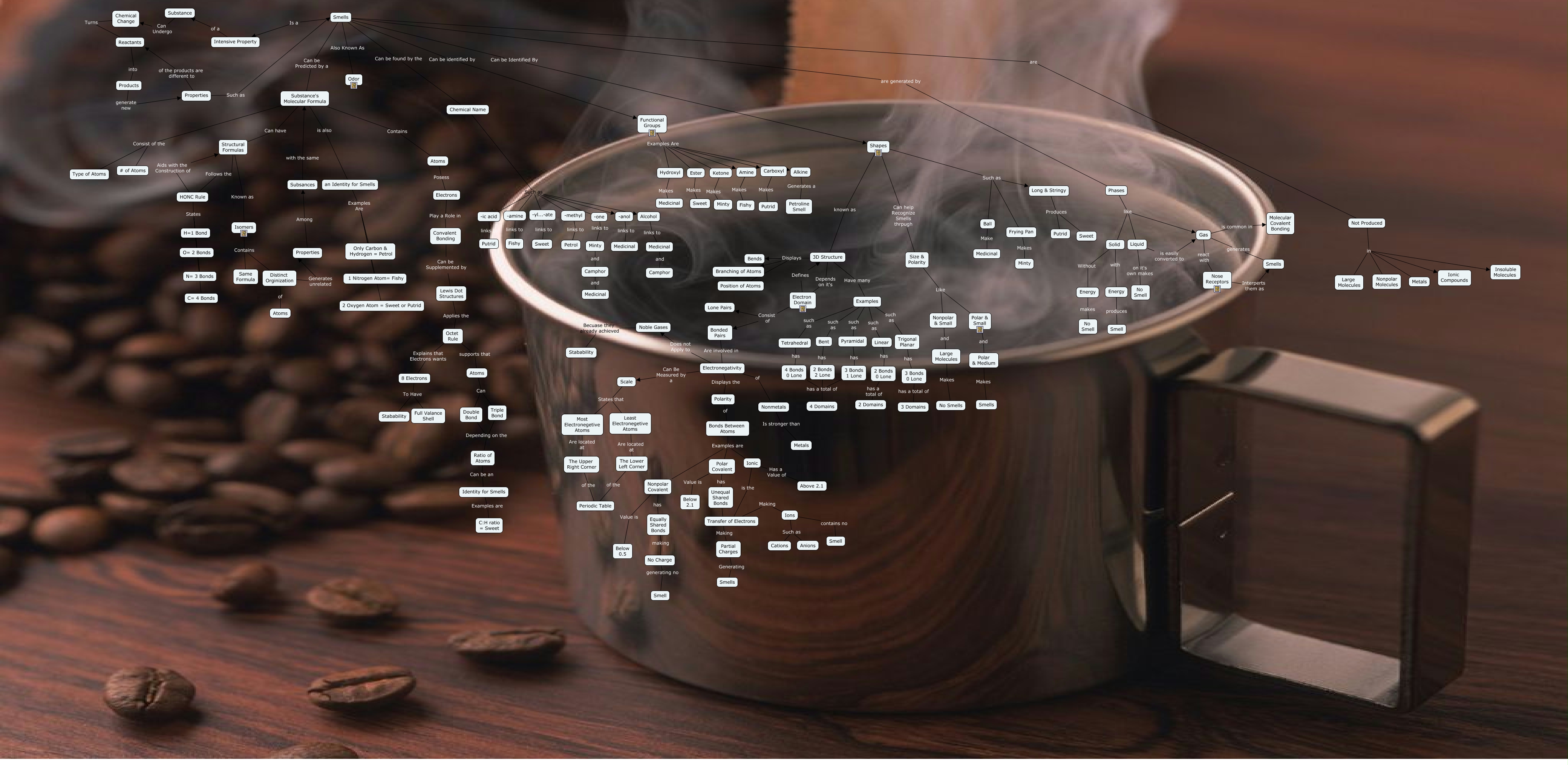 This Concept Map, created with IHMC CmapTools, has information related to: Smells Concept Map Full Unit (Draft), Double Bond Depending on the Ratio of Atoms, Substance Can Undergo Chemical Change, Bonded Pairs Are involved in Electronegativity, 3D Structure Depends on it's Electron Domain, Shapes known as 3D Structure, Ester Makes Sweet, Not Produced in Insoluble Molecules, Smells Also Known As Odor, Shapes Such as Ball, Long & Stringy Produces Putrid, Hydroxyl Makes Medicinal, -amine links to Fishy, Medicinal and Camphor, Size & Polarity Like Nonpolar & Small, Isomers Contains Same Formula, Chemical Name Such as -one, HONC Rule States C= 4 Bonds, Chemical Name Such as Alcohol, Nonmetals Is stronger than Metals, Functional Groups Examples Are Ketone