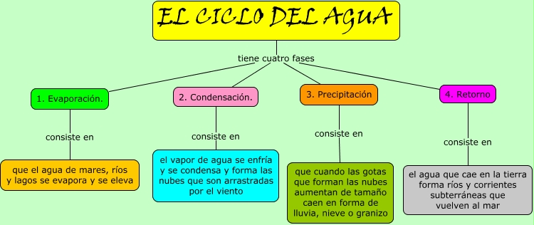 Este Cmap, tiene información relacionada con: El ciclo del agua, 1. Evaporación. consiste en que el agua de mares, ríos y lagos se evapora y se eleva, 4. Retorno consiste en el agua que cae en la tierra forma ríos y corrientes subterráneas que vuelven al mar, EL CICLO DEL AGUA tiene cuatro fases 3. Precipitación, EL CICLO DEL AGUA tiene cuatro fases 1. Evaporación., 2. Condensación. consiste en el vapor de agua se enfría y se condensa y forma las nubes que son arrastradas por el viento, EL CICLO DEL AGUA tiene cuatro fases 4. Retorno, EL CICLO DEL AGUA tiene cuatro fases 2. Condensación., 3. Precipitación consiste en que cuando las gotas que forman las nubes aumentan de tamaño caen en forma de lluvia, nieve o granizo